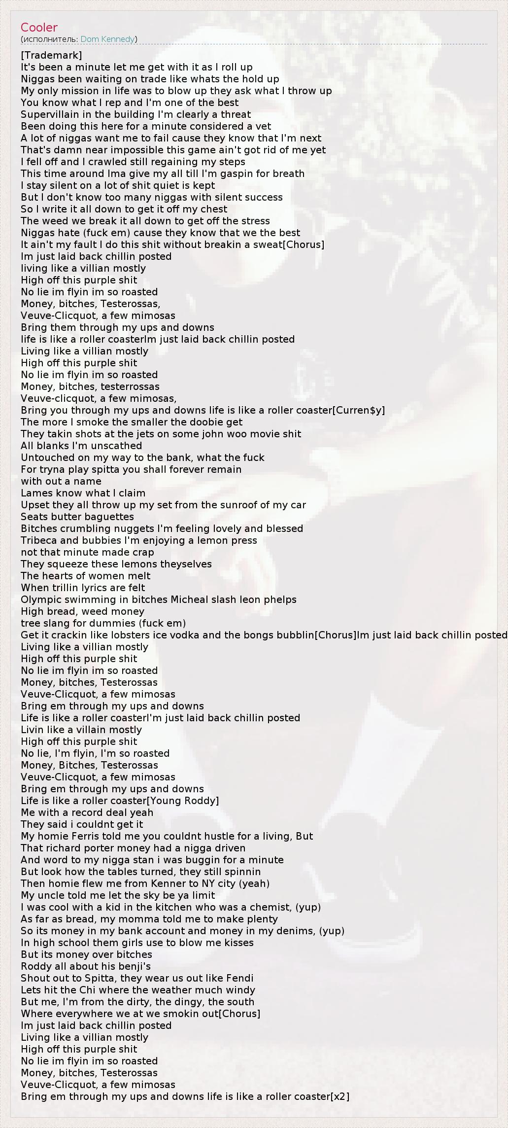 Это интересно:Dom Kennedy graced the streets of Los Angeles in 2008 with the release of his debut project, entitled 25th Hour. The Leimert Park native made a name for himself by performing at various events and venues including the popular Sneaker Pimps Tour and the world famous House of Blues. The amazing response to his live shows ignited his ambitions to distribute, promote and along with his cousin Jason Madison co-produce the 25th Hour mix-tape, which now stays in heavy rotation on Southern California play-lists. With his witty yet ingenious lyrics, Dom Kennedy has proven that he is not your average West Coast emcee… .. Dom can remember, at the age of 12, when he would listen to the great Hip-Hop records... продолжение