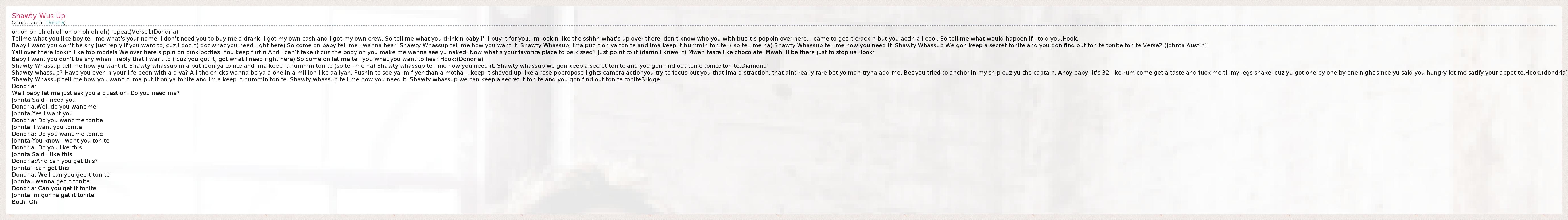 Baby I want you don't be shy just reply if you want to, cuz I got it( got what you need right here) So come on baby tell me I wanna hear. Shawty Whassup tell me how you want it. Shawty Whassup, Ima put it on ya tonite and Ima keep it hummin tonite. ( so tell me na) Shawty Whassup tell me how you need it. Shawty Whassup We gon keep a secret tonite and you gon find out tonite tonite tonite.Verse2 (Johnta Austin):
