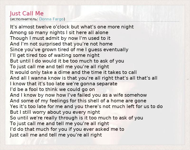 It's almost twelve o'clock but what's one more night Among so many nights I sit here all alone Though I must admit by now I'm used to it And I'm not surprised that you're not home Since you've grown tired of me I guess eventually I'll get tired too of waiting some night But until I do would it be too much to ask of you To just call me and tell me you're all right It would only take a dime and the time it takes to call And all I wanna know is that you're all right that's all that's all I know that it's too late we're gonna separate I'd be a fool to think we could go on And I know by now how I've failed you as a wife somehow And some of my feelings for this shell of a home are gone Yes it's too late for me and you there's not much left for us to do But I still worry about you every night So until we're really through is it too much to ask of you To just call me and tell me you're all right I'd do that much for you if you ever asked me to Just call me and tell me you're all right