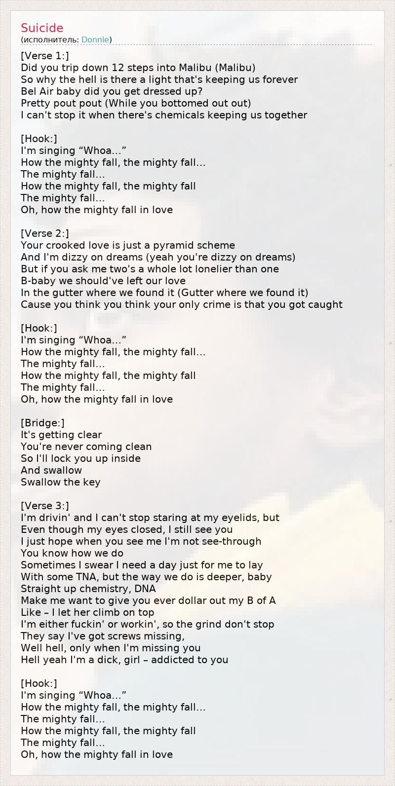 [Verse 1:] Did you trip down 12 steps into Malibu (Malibu) So why the hell is there a light that's keeping us forever Bel Air baby did you get dressed up? Pretty pout pout (While you bottomed out out) I can't stop it when there's chemicals keeping us together [Hook:] I'm singing “Whoa…” How the mighty fall, the mighty fall… The mighty fall… How the mighty fall, the mighty fall The mighty fall… Oh, how the mighty fall in love [Verse 2:] Your crooked love is just a pyramid scheme And I'm dizzy on dreams (yeah you're dizzy on dreams) But if you ask me two's a whole lot lonelier than one B-baby we should've left our love In the gutter where we found it (Gutter where we found it) Cause you think you think your only crime is that you got caught [Hook:] I'm singing “Whoa…” How the mighty fall, the mighty fall… The mighty fall… How the mighty fall, the mighty fall The mighty fall… Oh, how the mighty fall in love [Bridge:] It's getting clear You're never coming clean So I'll lock you up inside And swallow Swallow the key [Verse 3:] I'm drivin' and I can't stop staring at my eyelids, but Even though my eyes closed, I still see you I just hope when you see me I'm not see-through You know how we do Sometimes I swear I need a day just for me to lay With some TNA, but the way we do is deeper, baby Straight up chemistry, DNA Make me want to give you ever dollar out my B of A Like – I let her climb on top I'm either fuckin' or workin', so the grind don't stop They say I've got screws missing, Well hell, only when I'm missing you Hell yeah I'm a dick, girl – addicted to you [Hook:] I'm singing “Whoa…” How the mighty fall, the mighty fall… The mighty fall… How the mighty fall, the mighty fall The mighty fall… Oh, how the mighty fall in love