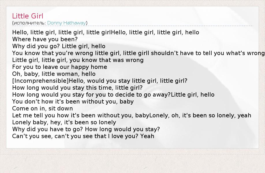 Hello, little girl, little girl, little girlHello, little girl, little girl, hello Where have you been? Why did you go? Little girl, hello You know that you're wrong little girl, little girlI shouldn't have to tell you what's wrong Little girl, little girl, you know that was wrong For you to leave our happy home Oh, baby, little woman, hello [Incomprehensible]Hello, would you stay little girl, little girl? How long would you stay this time, little girl? How long would you stay for you to decide to go away?Little girl, hello You don't how it's been without you, baby Come on in, sit down Let me tell you how it's been without you, babyLonely, oh, it's been so lonely, yeah Lonely baby, hey, it's been so lonely Why did you have to go? How long would you stay? Can't you see, can't you see that I love you? Yeah