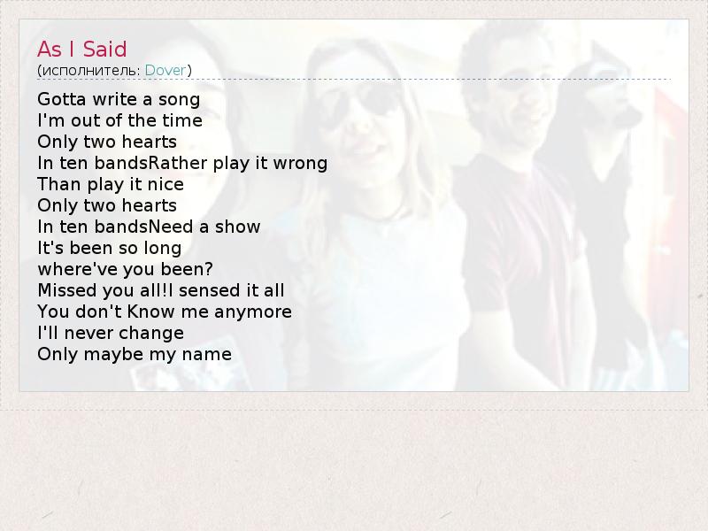 Gotta write a song I'm out of the time Only two hearts In ten bandsRather play it wrong Than play it nice Only two hearts In ten bandsNeed a show It's been so long where've you been? Missed you all!I sensed it all You don't Know me anymore I'll never change Only maybe my name