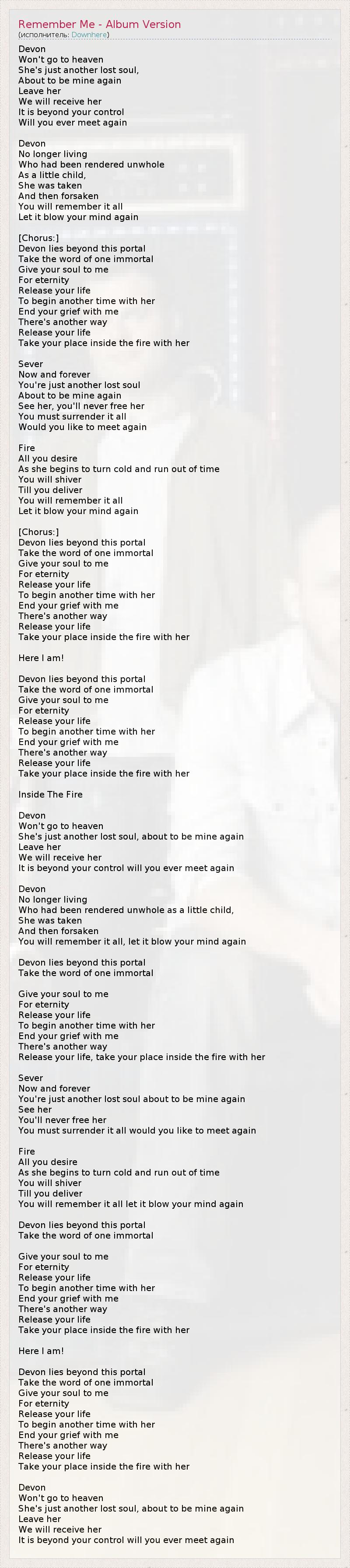 Девон Не попадет в рай. Она – лишь еще одна заблудшая душа, Которая вскоре тоже станет моей. Оставь ее, Мы возьмем ее. Ты не в силах изменить то, Встретитесь ли вы снова... Девон, Не живущая более, В душу которой наплевали, Когда она была ещё ребенком. Ее взяли, А потом она оказалась брошенной. Ты будешь помнить всё до мельчайших деталей, Пусть от этого у тебя поедет крыша... [Припев:] Девон покоится за этой дверью, Прислушайся же к словам одного из бессмертных, Отдай свою душу мне Навечно. Откажись от жизни, Чтобы начать новую жизнь вместе с ней, Покончи со своей печалью - я помогу в этом, Есть другой путь - Откажись от жизни, Займи свое место в огне с ней. Разорвать, Раз и навсегда... Ты - лишь еще одна заблудшая душа, Которая вскоре тоже станет моей Взгляни на нее – тебе никогда ее не освободить, Ты должен отдать всё, Если хочешь снова получить её. Огонь – Единственное, чего ты желаешь, Когда она начинает холодеть и становится неподвластной времени... Ты будешь трепетать, Пока не освободишься. Ты будешь помнить всё до мельчайших деталей, Пусть от этого у тебя поедет крыша... [Припев:] Девон покоится за этой дверью, Прислушайся же к словам одного из бессмертных, Отдай свою душу мне Навечно. Откажись от жизни, Чтобы начать новую жизнь вместе с ней, Покончи со своей печалью - я помогу в этом, Есть другой путь - Откажись от жизни, Займи свое место в огне с ней. Вот и я! Девон покоится за этой дверью, Прислушайся же к словам одного из бессмертных, Отдай свою душу мне Навечно. Откажись от жизни, Чтобы начать новую жизнь вместе с ней, Покончи со своей печалью - я помогу в этом, Есть другой путь - Откажись от жизни, Займи свое место в огне с ней. В огне (перевод ikra из Николаева) Девон, С рая вали вон. Она заблудшая душа, что, как и все попала в плен. Брось ты, Ее возьмём мы. Шанс устроить снова встречу с ней – всего лишь тлен. Девон Осуществил план Убив, ту, у которой с детства в душе был шрам. Взяли, Потом прогнали. Ты будешь помнить это, пока с тобой не рухнут храмы. Девон скрыт за этой дверью, Мертвецам этим поверь ты. Душу ты отдай На века, так и знай. Продай ты жизнь, чтобы снова вместе с нею быть. Не впадай в печаль, Другой путь дерзай: Продай ты жизнь, чтобы с ней в огне снова ожить. Кончи И не строй козни Ты лишь заблудшая душа, что, как и все попала в плен. Смотри, Давай без дури. Отдай ты всё, что есть, и будешь снова с ней блажен. Пламя – Вот всё, что надо, Чтобы согреть ледяное тело твоей любимой дамы. Ходу, И на свободу. Ты будешь помнить это, пока с тобой не рухнут храмы. Девон скрыт за этой дверью, Мертвецам этим поверь ты. Душу ты отдай На века, так и знай. Продай ты жизнь, чтобы снова вместе с нею быть. Не впадай в печаль, Другой путь дерзай: Продай ты жизнь, чтобы с ней в огне снова ожить. Вот и я! Душу ты отдай На века, так и знай. Продай ты жизнь, чтобы снова вместе с нею быть. Не впадай в печаль, Другой путь дерзай: Продай ты жизнь, чтобы с ней в огне снова ожить. Девон С рая вали вон. Она заблудшая душа, что, как и все попала в плен. Брось ты, Ее возьмём мы. Шанс устроить снова встречу с ней – всего лишь тлен.