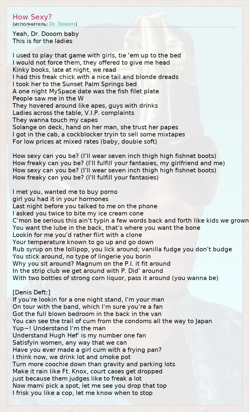 Yeah, Dr. Dooom baby This is for the ladies I used to play that game with girls, tie 'em up to the bed I would not force them, they offered to give me head Kinky books, late at night, we read I had this freak chick with a nice tail and blonde dreads I took her to the Sunset Palm Springs bed A one night MySpace date was the fish filet plate People saw me in the W They hovered around like apes, guys with drinks Ladies across the table, V.I.P. complaints They wanna touch my capes Solange on deck, hand on her man, she trust her papes I got in the cab, a cockblocker tryin to sell some mixtapes For low prices at mixed rates (baby, double soft) How sexy can you be? (I'll wear seven inch thigh high fishnet boots) How freaky can you be? (I'll fulfill your fantasies, my girlfriend and me) How sexy can you be? (I'll wear seven inch thigh high fishnet boots) How freaky can you be? (I'll fulfill your fantasies) I met you, wanted me to buy porno girl you had it in your hormones Last night before you talked to me on the phone I asked you twice to bite my ice cream cone C'mon be serious this ain't typin a few words back and forth like kids we grown You want the lube in the back, that's where you want the bone Lookin for me you'd rather flirt with a clone Your temperature known to go up and go down Rub syrup on the lollipop, you lick around; vanilla fudge you don't budge You stick around, no type of lingerie you borin Why you sit around? Magnum on the P.I. it fit around In the strip club we get around with P. Did' around With two bottles of strong corn liquor, pass it around (you wanna be) [Denis Deft:] If you're lookin for a one night stand, I'm your man On tour with the band, which I'm sure you're a fan Got the full blown bedroom in the back in the van You can see the trail of cum from the condoms all the way to Japan Yup~! Understand I'm the man Understand Hugh Hef' is my number one fan Satisfyin women, any way that we can Have you ever made a girl cum with a frying pan? I think now, we drink lot and smoke pot Turn more coochie down than gravity and parking lots Make it rain like Ft. Knox, court cases get dropped just because them judges like to freak a lot Now mami pick a spot, let me see you drop that top I frisk you like a cop, let me know when to stop