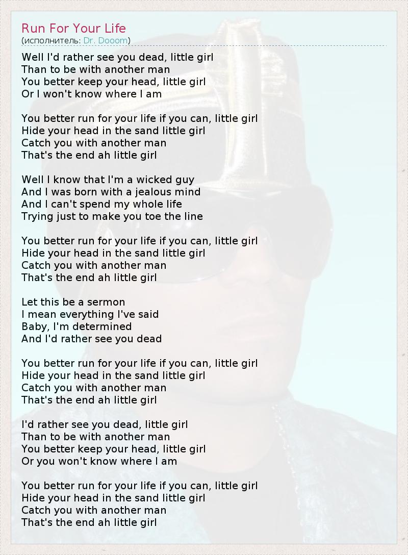 Well I'd rather see you dead, little girl Than to be with another man You better keep your head, little girl Or I won't know where I am You better run for your life if you can, little girl Hide your head in the sand little girl Catch you with another man That's the end ah little girl Well I know that I'm a wicked guy And I was born with a jealous mind And I can't spend my whole life Trying just to make you toe the line You better run for your life if you can, little girl Hide your head in the sand little girl Catch you with another man That's the end ah little girl Let this be a sermon I mean everything I've said Baby, I'm determined And I'd rather see you dead You better run for your life if you can, little girl Hide your head in the sand little girl Catch you with another man That's the end ah little girl I'd rather see you dead, little girl Than to be with another man You better keep your head, little girl Or you won't know where I am You better run for your life if you can, little girl Hide your head in the sand little girl Catch you with another man That's the end ah little girl