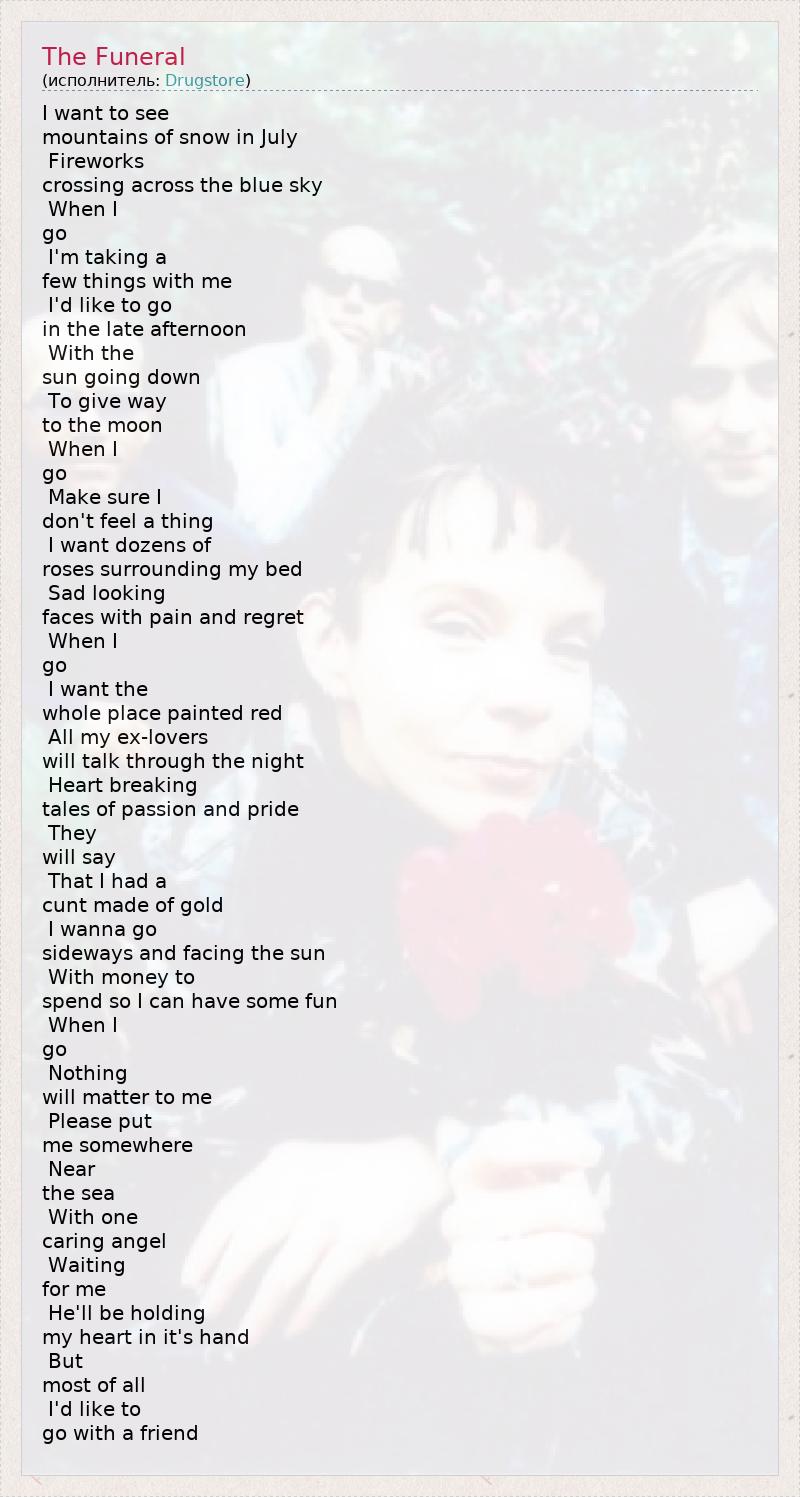 Это интересно:Drugstore are a London-based alternative and dream pop band led by Brazilian singer-songwriter and bassist Isabel Monteiro (b. São Paulo, Brazil), who relocated to England in 1990s, with Dave Hunter (later replaced by Daron Robinson) on guitar and Mike Chylinski on drums. The band's name is taken from the 1989 Gus Van Sant film, Drugstore Cowboy.The band was formed in 1993 by Monteiro, Hunter and Chylinski. Shortly before the release of their first single "Alive” in 1994, Hunter was replaced by Daron Robinson. Soon after this, the band signed a major record deal with Go! Discs. A number of singles earned them Single Of The Week awards, as Drugstore's rise continued. The band... продолжение