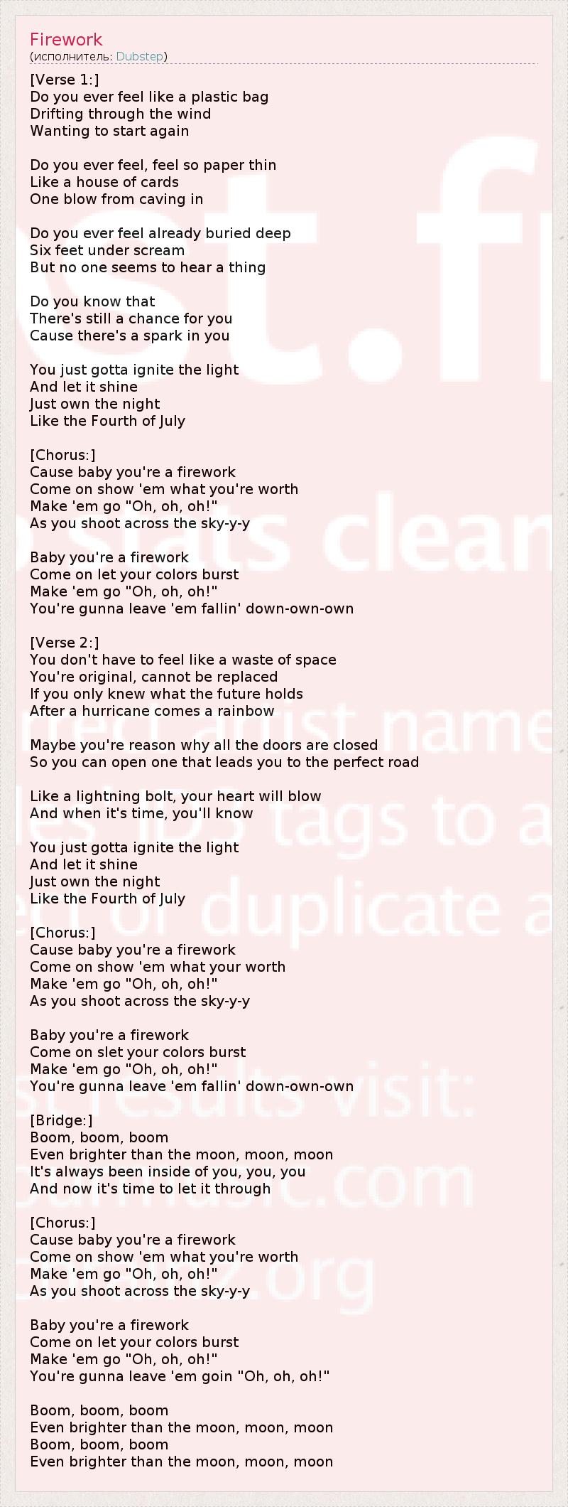 [1-ый куплет:] Ты когда-нибудь ощущаешь себя целлофановым пакетом, Который ветер носит из стороны в сторону И которому хочется всё начать сначала? Ты когда-нибудь ощущаешь себя тонким, как листок бумаги, Как карточный домик, Разлетающийся от лёгкого дуновения? Ты когда-нибудь ощущаешь себя похороненным Под слоем криков толщиной в шесть футов Так, что никто тебя, кажется, не слышит? Ты знаешь, Что у тебя ещё есть шанс? Потому что в тебе есть искра... Тебе просто нужно суметь зажечь от неё свет И дать ему осветить всё вокруг, Получить власть над ночью, Как в День Независимости! 1 [Припев:] Ведь, детка, ты - фейерверк! Иди и покажи всем, чего ты стоишь! Сделай так, чтобы все ахнули, Когда ты взмоешь в небо! Детка - ты фейерверк! Давай, покажи свои взрывные цвета! Сделай так, чтобы все ахнули! Глядя на тебя, они выпадут в осадок! [2-ой куплет:] Ты не должен ощущать себя пустым местом. Ты особенный и незаменимый! Если бы ты только знал, что сулит будущее - После урагана появится радуга. Может, ты сам причина того, почему все двери закрыты, Поэтому ты сможешь открыть ту, за которой откроется твой истинный путь. Это случится как удар молнии, твоё сердце всколыхнётся. И когда пробьёт твой час - ты поймёшь это... Тебе просто нужно суметь зажечь от неё свет И дать ему осветить всё вокруг, Получить власть над ночью, Как в День Независимости! [Припев:] Ведь, детка, ты - фейерверк! Иди и покажи всем, чего ты стоишь! Сделай так, чтобы все ахнули, Когда ты взмоешь в небо! Детка - ты фейерверк! Давай, покажи свои взрывные цвета! Сделай так, чтобы все ахнули! Глядя на тебя, они выпадут в осадок! [Переход:] Бум, бум, бум... Даже ярче, чем луна, луна, луна... Это всегда было в тебе, в тебе, в тебе... А теперь пришло время показать это всем... [Припев:] Ведь, детка, ты - фейерверк! Иди и покажи всем, чего ты стоишь! Сделай так, чтобы все ахнули, Когда ты взмоешь в небо! Детка - ты фейерверк! Давай, покажи свои взрывные цвета! Сделай так, чтобы все ахнули! Ты заставишь их раскрыть рот от удивления! Бум, бум, бум... Даже ярче, чем луна, луна, луна... Бум, бум, бум... Даже ярче, чем луна, луна, луна... 1 - Fourth of July - амер. 4 июля (день провозглашения независимости США). Как правило, празднование проходит с традиционным фейерверком.