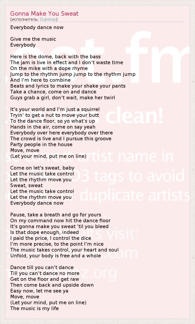 Everybody dance now Give me the music Everybody Here is the dome, back with the bass The jam is live in effect and I don't waste time On the mike with a dope rhyme Jump to the rhythm jump jump to the rhythm jump And I'm here to combine Beats and lyrics to make your shake your pants Take a chance, come on and dance Guys grab a girl, don't wait, make her twirl It's your world and I'm just a squirrel Tryin' to get a nut to move your butt To the dance floor, so yo what's up Hands in the air, come on say yeah Everybody over here everybody over there The crowd is live and I pursue this groove Party people in the house Move, move (Let your mind, put me on line) Come on let's sweat, baby Let the music take control Let the rhythm move you Sweat, sweat Let the music take control Let the rhythm move you Everybody dance now Pause, take a breath and go for yours On my command now hit the dance floor It's gonna make you sweat 'til you bleed Is that dope enough, indeed I paid the price, I control the dice I'm more precise, to the point I'm nice The music takes control, your heart and soul Unfold, your body is free and a whole Dance till you can't dance Till you can't dance no more Get on the floor and get raw Then come back and upside down Easy now, let me see ya Move, move (Let your mind, put me on line) The music is my life