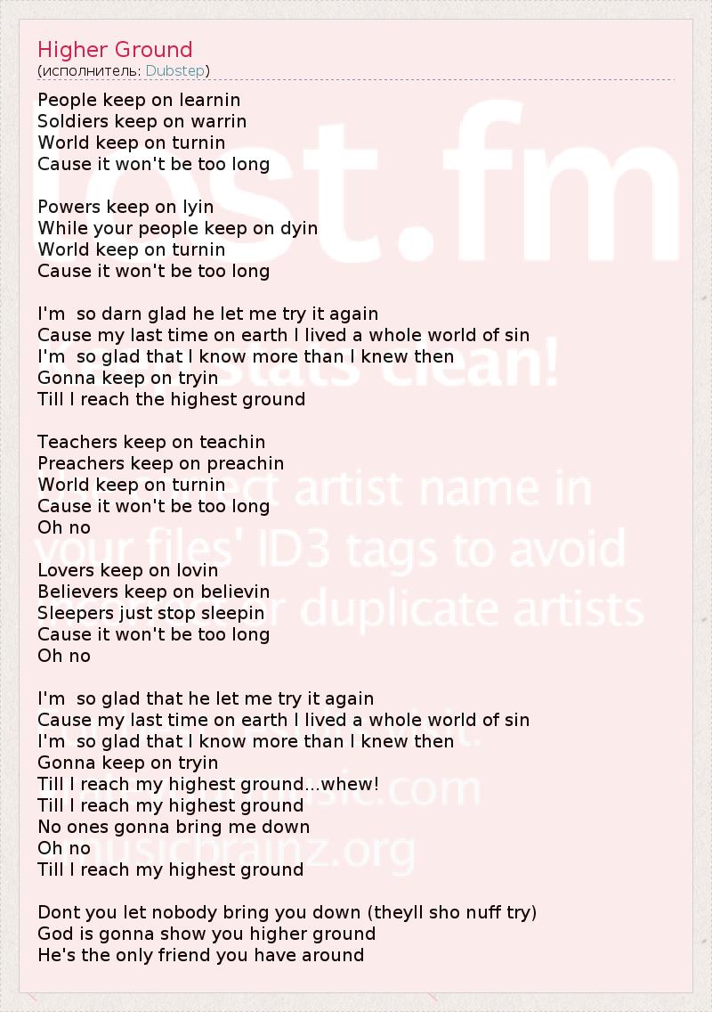People keep on learnin Soldiers keep on warrin World keep on turnin Cause it won't be too long Powers keep on lyin While your people keep on dyin World keep on turnin Cause it won't be too long I'm so darn glad he let me try it again Cause my last time on earth I lived a whole world of sin I'm so glad that I know more than I knew then Gonna keep on tryin Till I reach the highest ground Teachers keep on teachin Preachers keep on preachin World keep on turnin Cause it won't be too long Oh no Lovers keep on lovin Believers keep on believin Sleepers just stop sleepin Cause it won't be too long Oh no I'm so glad that he let me try it again Cause my last time on earth I lived a whole world of sin I'm so glad that I know more than I knew then Gonna keep on tryin Till I reach my highest ground...whew! Till I reach my highest ground No ones gonna bring me down Oh no Till I reach my highest ground Dont you let nobody bring you down (theyll sho nuff try) God is gonna show you higher ground He's the only friend you have around