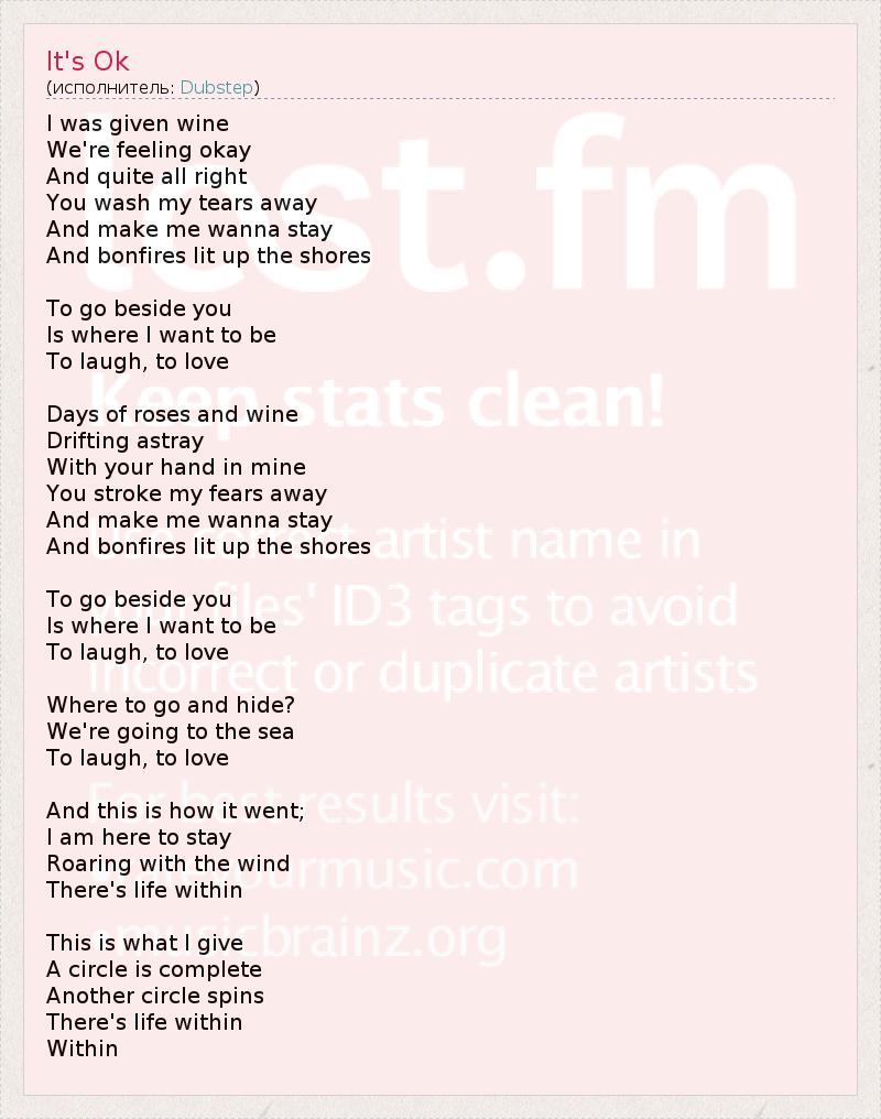 I was given wine We're feeling okay And quite all right You wash my tears away And make me wanna stay And bonfires lit up the shores To go beside you Is where I want to be To laugh, to love Days of roses and wine Drifting astray With your hand in mine You stroke my fears away And make me wanna stay And bonfires lit up the shores To go beside you Is where I want to be To laugh, to love Where to go and hide? We're going to the sea To laugh, to love And this is how it went; I am here to stay Roaring with the wind There's life within This is what I give A circle is complete Another circle spins There's life within Within