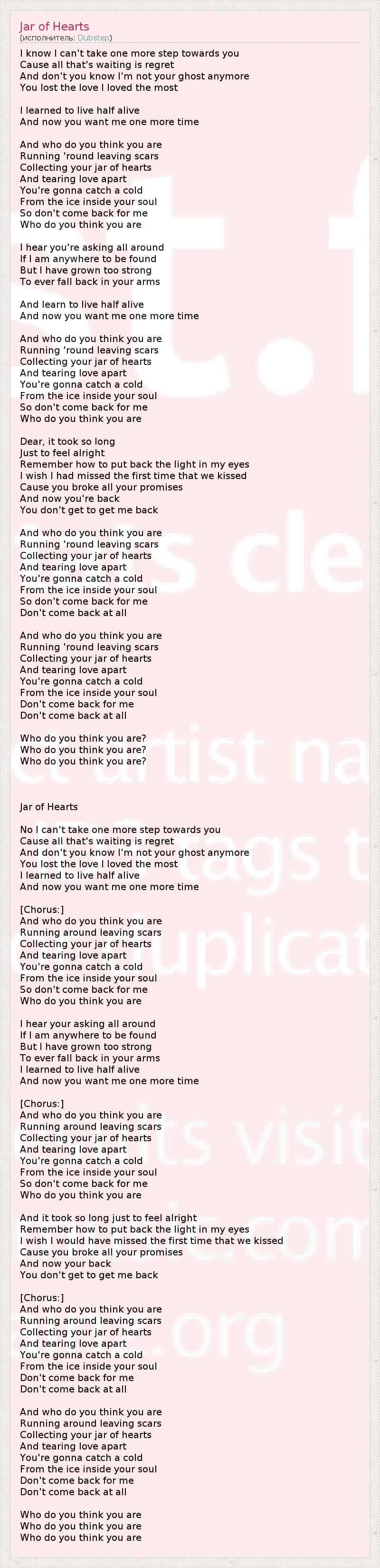 I know I can't take one more step towards you Cause all that's waiting is regret And don't you know I'm not your ghost anymore You lost the love I loved the most I learned to live half alive And now you want me one more time And who do you think you are Running 'round leaving scars Collecting your jar of hearts And tearing love apart You're gonna catch a cold From the ice inside your soul So don't come back for me Who do you think you are I hear you're asking all around If I am anywhere to be found But I have grown too strong To ever fall back in your arms And learn to live half alive And now you want me one more time And who do you think you are Running 'round leaving scars Collecting your jar of hearts And tearing love apart You're gonna catch a cold From the ice inside your soul So don't come back for me Who do you think you are Dear, it took so long Just to feel alright Remember how to put back the light in my eyes I wish I had missed the first time that we kissed Cause you broke all your promises And now you're back You don't get to get me back And who do you think you are Running 'round leaving scars Collecting your jar of hearts And tearing love apart You're gonna catch a cold From the ice inside your soul So don't come back for me Don't come back at all And who do you think you are Running 'round leaving scars Collecting your jar of hearts And tearing love apart You're gonna catch a cold From the ice inside your soul Don't come back for me Don't come back at all Who do you think you are? Who do you think you are? Who do you think you are? Jar of Hearts No I can't take one more step towards you Cause all that's waiting is regret And don't you know I'm not your ghost anymore You lost the love I loved the most I learned to live half alive And now you want me one more time [Chorus:] And who do you think you are Running around leaving scars Collecting your jar of hearts And tearing love apart You're gonna catch a cold From the ice inside your soul So don't come back for me Who do you think you are I hear your asking all around If I am anywhere to be found But I have grown too strong To ever fall back in your arms I learned to live half alive And now you want me one more time [Chorus:] And who do you think you are Running around leaving scars Collecting your jar of hearts And tearing love apart You're gonna catch a cold From the ice inside your soul So don't come back for me Who do you think you are And it took so long just to feel alright Remember how to put back the light in my eyes I wish I would have missed the first time that we kissed Cause you broke all your promises And now your back You don't get to get me back [Chorus:] And who do you think you are Running around leaving scars Collecting your jar of hearts And tearing love apart You're gonna catch a cold From the ice inside your soul Don't come back for me Don't come back at all And who do you think you are Running around leaving scars Collecting your jar of hearts And tearing love apart You're gonna catch a cold From the ice inside your soul Don't come back for me Don't come back at all Who do you think you are Who do you think you are Who do you think you are