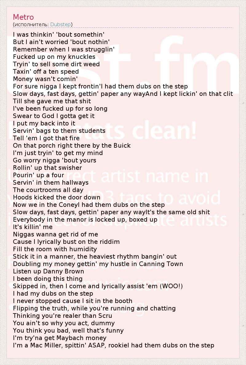 I was thinkin' 'bout somethin' But I ain't worried 'bout nothin' Remember when I was strugglin' Fucked up on my knuckles Tryin' to sell some dirt weed Taxin' off a ten speed Money wasn't comin' For sure nigga I kept frontin'I had them dubs on the step Slow days, fast days, gettin' paper any wayAnd I kept lickin' on that clit Till she gave me that shit I've been fucked up for so long Swear to God I gotta get it I put my back into it Servin' bags to them students Tell 'em I got that fire On that porch right there by the Buick I'm just tryin' to get my mind Go worry nigga 'bout yours Rollin' up that swisher Pourin' up a four Servin' in them hallways The courtrooms all day Hoods kicked the door down Now we in the ConeyI had them dubs on the step Slow days, fast days, gettin' paper any wayIt's the same old shit Everybody in the manor is locked up, boxed up It's killin' me Niggas wanna get rid of me Cause I lyrically bust on the riddim Fill the room with humidity Stick it in a manner, the heaviest rhythm bangin' out Doubling my money gettin' my hustle in Canning Town Listen up Danny Brown I been doing this thing Skipped in, then I come and lyrically assist 'em (WOO!) I had my dubs on the step I never stopped cause I sit in the booth Flipping the truth, while you're running and chatting Thinking you're realer than Scru You ain't so why you act, dummy You think you bad, well that's funny I'm try'na get Maybach money I'm a Mac Miller, spittin' ASAP, rookieI had them dubs on the step