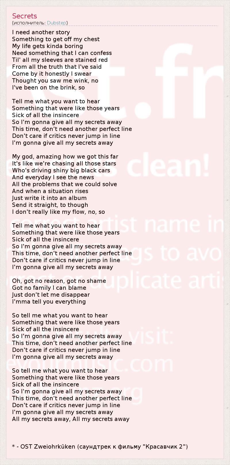 Я хотел бы прожить жизнь по-иному И сбросить груз с моей груди. Жить надоело… Мне есть в чем признаться, Пока я руки не запятнал в крови От всей правды, которой я сказал. Я честен, я клянусь, Думаешь, я закрыл на все глаза, неправда, Я нахожусь на срыве, так что Скажи, что ты хочешь услышать Что-то, что напоминает о тех годах. Как надоела вся эта фальшь! Поэтому я выдам все свои секреты… На этот раз я обойдусь без оптимального решения. Мне даже все равно, если критики никогда не врубятся. Я собираюсь раскрыть все свои секреты… Боже мой, удивительно, как мы продвинулись, Как будто мы следим за звездами. Каждый день новые сплетни, Кто какие машины водит. Все проблемы мы могли бы разрешить. При приятных обстоятельствах Просто писать это в песнях, Выпускать альбомы, хотя На самом деле мне не нравится моя песня, нет, так что Скажи, что ты хочешь услышать Что-то, что напоминает о тех годах. Как надоела вся эта фальшь! Поэтому я выдам все свои секреты… На этот раз я обойдусь без оптимального решения. Мне даже все равно, если критики никогда не врубятся. Я собираюсь раскрыть все свои секреты… О, я безрассуден и бесстыж, Я не могу упрекать свою семью, Просто не дай мне пропасть, Я расскажу тебе все… Скажи, что ты хочешь услышать Что-то, что напоминает о тех годах. Как надоела вся эта фальшь! Поэтому я выдам все свои секреты… На этот раз я обойдусь без оптимального решения. Мне даже все равно, если критики никогда не врубятся. Я собираюсь раскрыть все свои секреты… Скажи, что ты хочешь услышать Что-то, что напоминает о тех годах. Как надоела вся эта фальшь! Поэтому я выдам все свои секреты… На этот раз я обойдусь без оптимального решения. Мне даже все равно, если критики никогда не врубятся. Я собираюсь раскрыть все свои секреы, Все свои секреты, все свои секреты…