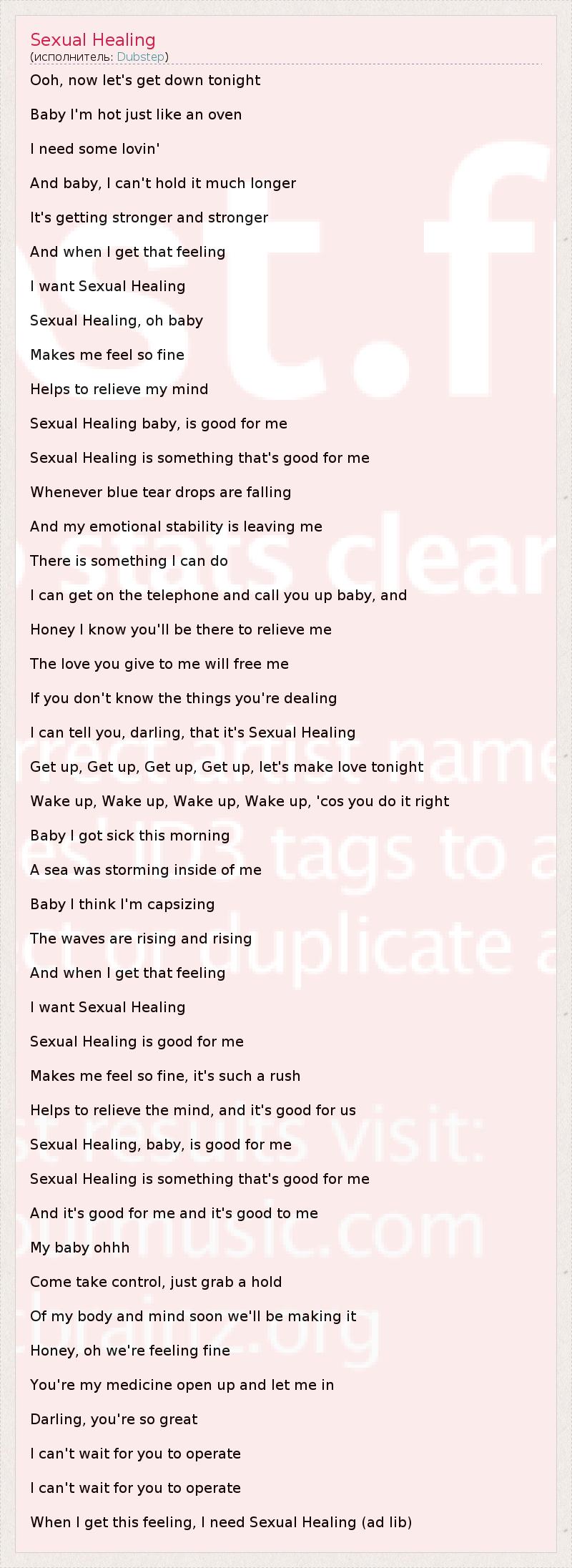 Ooh, now let's get down tonight Baby I'm hot just like an oven I need some lovin' And baby, I can't hold it much longer It's getting stronger and stronger And when I get that feeling I want Sexual Healing Sexual Healing, oh baby Makes me feel so fine Helps to relieve my mind Sexual Healing baby, is good for me Sexual Healing is something that's good for me Whenever blue tear drops are falling And my emotional stability is leaving me There is something I can do I can get on the telephone and call you up baby, and Honey I know you'll be there to relieve me The love you give to me will free me If you don't know the things you're dealing I can tell you, darling, that it's Sexual Healing Get up, Get up, Get up, Get up, let's make love tonight Wake up, Wake up, Wake up, Wake up, 'cos you do it right Baby I got sick this morning A sea was storming inside of me Baby I think I'm capsizing The waves are rising and rising And when I get that feeling I want Sexual Healing Sexual Healing is good for me Makes me feel so fine, it's such a rush Helps to relieve the mind, and it's good for us Sexual Healing, baby, is good for me Sexual Healing is something that's good for me And it's good for me and it's good to me My baby ohhh Come take control, just grab a hold Of my body and mind soon we'll be making it Honey, oh we're feeling fine You're my medicine open up and let me in Darling, you're so great I can't wait for you to operate I can't wait for you to operate When I get this feeling, I need Sexual Healing (ad lib)