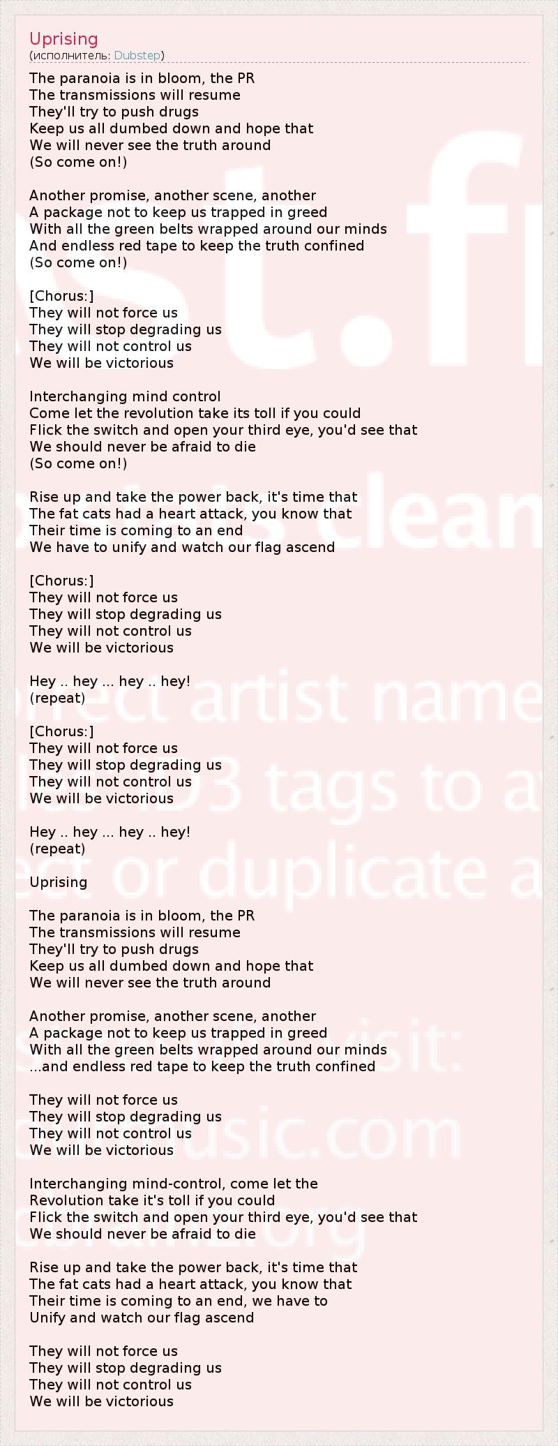 The paranoia is in bloom, the PR The transmissions will resume They'll try to push drugs Keep us all dumbed down and hope that We will never see the truth around (So come on!) Another promise, another scene, another A package not to keep us trapped in greed With all the green belts wrapped around our minds And endless red tape to keep the truth confined (So come on!) [Chorus:] They will not force us They will stop degrading us They will not control us We will be victorious Interchanging mind control Come let the revolution take its toll if you could Flick the switch and open your third eye, you'd see that We should never be afraid to die (So come on!) Rise up and take the power back, it's time that The fat cats had a heart attack, you know that Their time is coming to an end We have to unify and watch our flag ascend [Chorus:] They will not force us They will stop degrading us They will not control us We will be victorious Hey .. hey ... hey .. hey! (repeat) [Chorus:] They will not force us They will stop degrading us They will not control us We will be victorious Hey .. hey ... hey .. hey! (repeat) Uprising The paranoia is in bloom, the PR The transmissions will resume They'll try to push drugs Keep us all dumbed down and hope that We will never see the truth around Another promise, another scene, another A package not to keep us trapped in greed With all the green belts wrapped around our minds ...and endless red tape to keep the truth confined They will not force us They will stop degrading us They will not control us We will be victorious Interchanging mind-control, come let the Revolution take it's toll if you could Flick the switch and open your third eye, you'd see that We should never be afraid to die Rise up and take the power back, it's time that The fat cats had a heart attack, you know that Their time is coming to an end, we have to Unify and watch our flag ascend They will not force us They will stop degrading us They will not control us We will be victorious