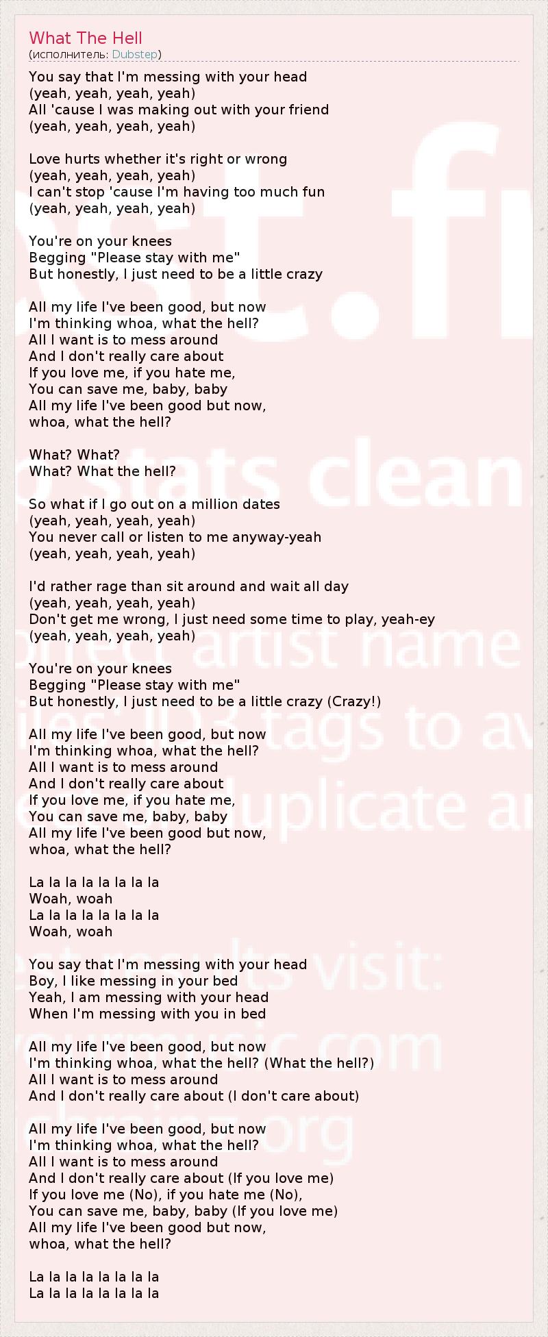 You say that I'm messing with your head (yeah, yeah, yeah, yeah) All 'cause I was making out with your friend (yeah, yeah, yeah, yeah) Love hurts whether it's right or wrong (yeah, yeah, yeah, yeah) I can't stop 'cause I'm having too much fun (yeah, yeah, yeah, yeah) You're on your knees Begging "Please stay with me" But honestly, I just need to be a little crazy All my life I've been good, but now I'm thinking whoa, what the hell? All I want is to mess around And I don't really care about If you love me, if you hate me, You can save me, baby, baby All my life I've been good but now, whoa, what the hell? What? What? What? What the hell? So what if I go out on a million dates (yeah, yeah, yeah, yeah) You never call or listen to me anyway-yeah (yeah, yeah, yeah, yeah) I'd rather rage than sit around and wait all day (yeah, yeah, yeah, yeah) Don't get me wrong, I just need some time to play, yeah-ey (yeah, yeah, yeah, yeah) You're on your knees Begging "Please stay with me" But honestly, I just need to be a little crazy (Crazy!) All my life I've been good, but now I'm thinking whoa, what the hell? All I want is to mess around And I don't really care about If you love me, if you hate me, You can save me, baby, baby All my life I've been good but now, whoa, what the hell? La la la la la la la la Woah, woah La la la la la la la la Woah, woah You say that I'm messing with your head Boy, I like messing in your bed Yeah, I am messing with your head When I'm messing with you in bed All my life I've been good, but now I'm thinking whoa, what the hell? (What the hell?) All I want is to mess around And I don't really care about (I don't care about) All my life I've been good, but now I'm thinking whoa, what the hell? All I want is to mess around And I don't really care about (If you love me) If you love me (No), if you hate me (No), You can save me, baby, baby (If you love me) All my life I've been good but now, whoa, what the hell? La la la la la la la la La la la la la la la la