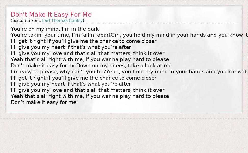 А как ты думаешь, о чем песня "Don't Make It Easy For Me" ?