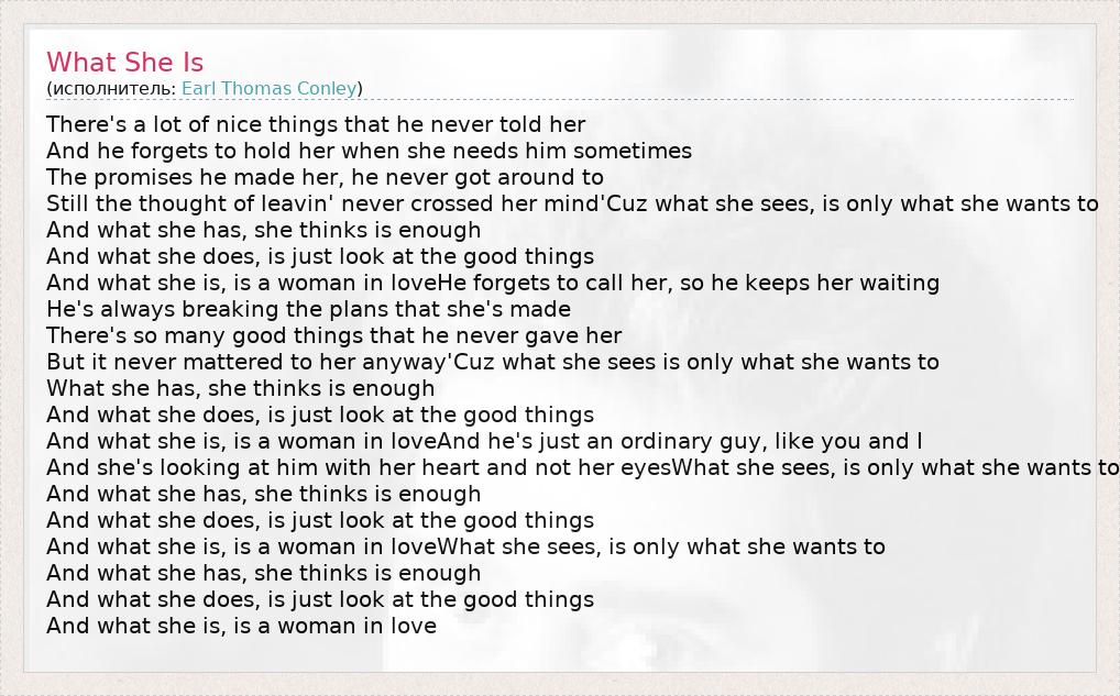 There's a lot of nice things that he never told her And he forgets to hold her when she needs him sometimes The promises he made her, he never got around to Still the thought of leavin' never crossed her mind'Cuz what she sees, is only what she wants to And what she has, she thinks is enough And what she does, is just look at the good things And what she is, is a woman in loveHe forgets to call her, so he keeps her waiting He's always breaking the plans that she's made There's so many good things that he never gave her But it never mattered to her anyway'Cuz what she sees is only what she wants to What she has, she thinks is enough And what she does, is just look at the good things And what she is, is a woman in loveAnd he's just an ordinary guy, like you and I And she's looking at him with her heart and not her eyesWhat she sees, is only what she wants to And what she has, she thinks is enough And what she does, is just look at the good things And what she is, is a woman in loveWhat she sees, is only what she wants to And what she has, she thinks is enough And what she does, is just look at the good things And what she is, is a woman in love