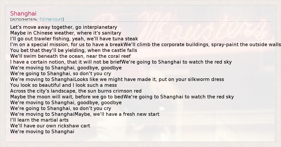Maybe the moon will wait, before we go to bedWe're going to Shanghai to watch the red sky