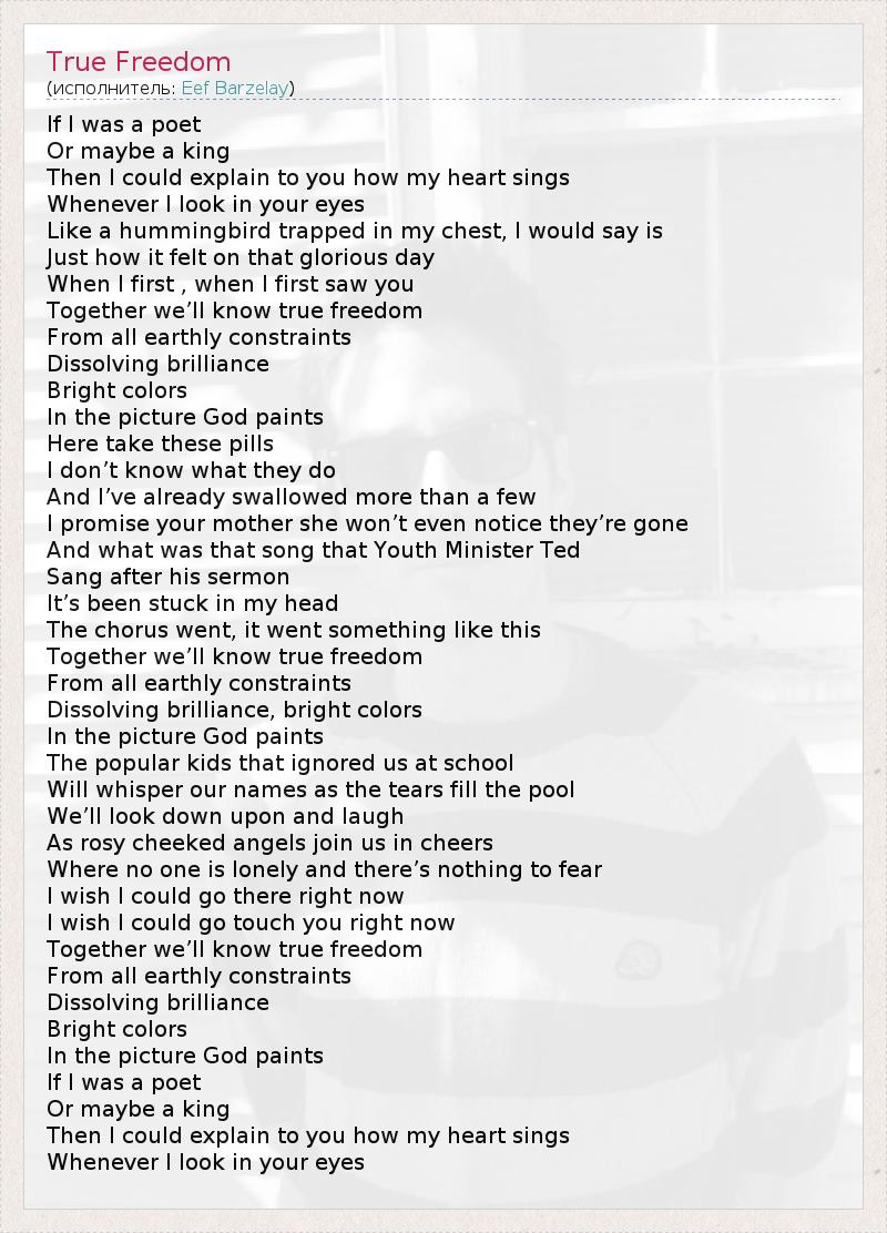 If I was a poet Or maybe a king Then I could explain to you how my heart sings Whenever I look in your eyes Like a hummingbird trapped in my chest, I would say is Just how it felt on that glorious day When I first , when I first saw you Together we’ll know true freedom From all earthly constraints Dissolving brilliance Bright colors In the picture God paints Here take these pills I don’t know what they do And I’ve already swallowed more than a few I promise your mother she won’t even notice they’re gone And what was that song that Youth Minister Ted Sang after his sermon It’s been stuck in my head The chorus went, it went something like this Together we’ll know true freedom From all earthly constraints Dissolving brilliance, bright colors In the picture God paints The popular kids that ignored us at school Will whisper our names as the tears fill the pool We’ll look down upon and laugh As rosy cheeked angels join us in cheers Where no one is lonely and there’s nothing to fear I wish I could go there right now I wish I could go touch you right now Together we’ll know true freedom From all earthly constraints Dissolving brilliance Bright colors In the picture God paints If I was a poet Or maybe a king Then I could explain to you how my heart sings Whenever I look in your eyes
