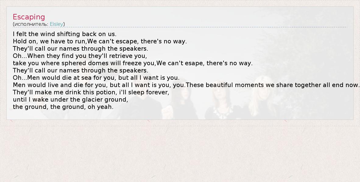 Это интересно:Eisley (Айсли) – инди-поп-рок-группа из города Тайлер, штат ТехасГруппа состоит из 5-ти участников:Шерри ДюПре - гитара, вокал; Стэйси ДюПре - клавишные, вокал; Уэстон ДюПре – ударные; Шантель ДюПре – гитара; Гэррон ДюПре – бас.Вначале, группа называлась Mos Eisley (как в Звёздных войнах), но потом, название сократили до Eisley, перед туром с Coldplay.Eisley выступали с такими группами, как Taking Back... продолжение