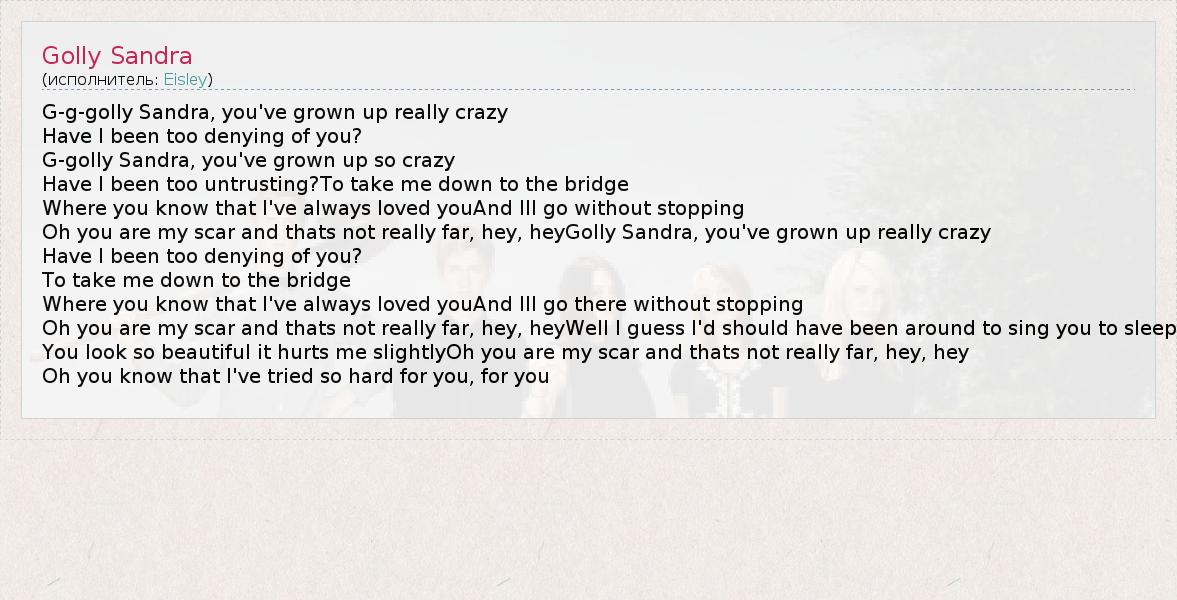 Oh you are my scar and thats not really far, hey, heyGolly Sandra, you've grown up really crazy