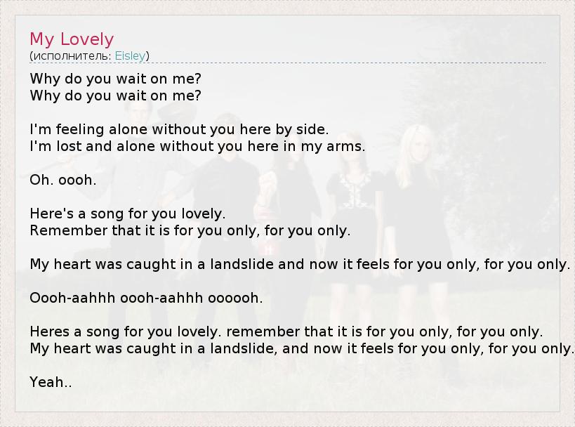 Why do you wait on me? Why do you wait on me? I'm feeling alone without you here by side. I'm lost and alone without you here in my arms. Oh. oooh. Here's a song for you lovely. Remember that it is for you only, for you only. My heart was caught in a landslide and now it feels for you only, for you only. Oooh-aahhh oooh-aahhh oooooh. Heres a song for you lovely. remember that it is for you only, for you only. My heart was caught in a landslide, and now it feels for you only, for you only. Yeah..