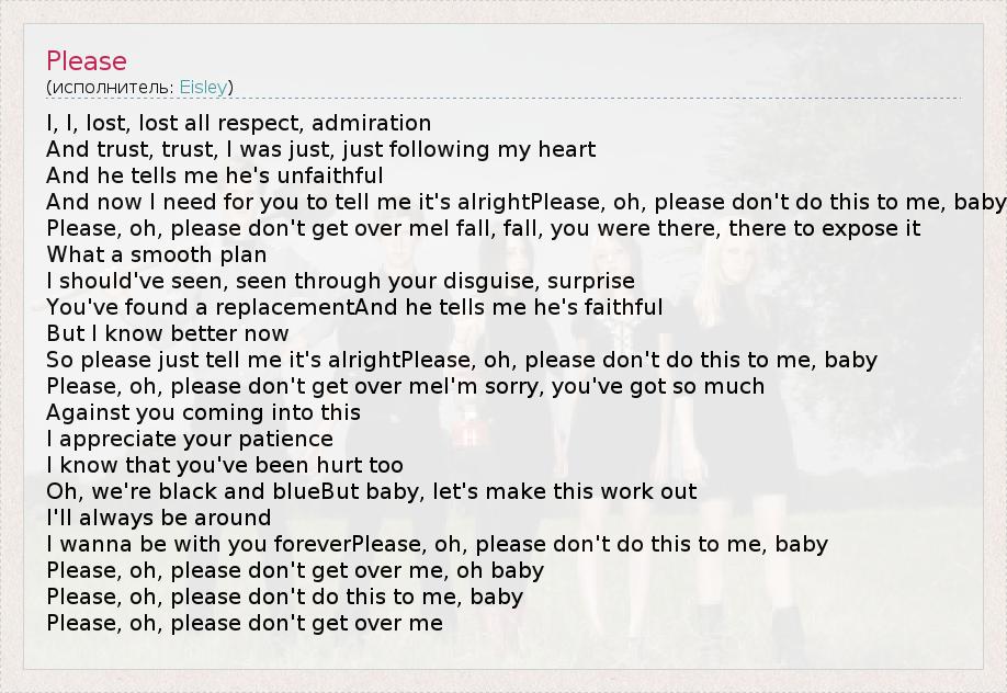 I, I, lost, lost all respect, admiration And trust, trust, I was just, just following my heart And he tells me he's unfaithful And now I need for you to tell me it's alrightPlease, oh, please don't do this to me, baby Please, oh, please don't get over meI fall, fall, you were there, there to expose it What a smooth plan I should've seen, seen through your disguise, surprise You've found a replacementAnd he tells me he's faithful But I know better now So please just tell me it's alrightPlease, oh, please don't do this to me, baby Please, oh, please don't get over meI'm sorry, you've got so much Against you coming into this I appreciate your patience I know that you've been hurt too Oh, we're black and blueBut baby, let's make this work out I'll always be around I wanna be with you foreverPlease, oh, please don't do this to me, baby Please, oh, please don't get over me, oh baby Please, oh, please don't do this to me, baby Please, oh, please don't get over me