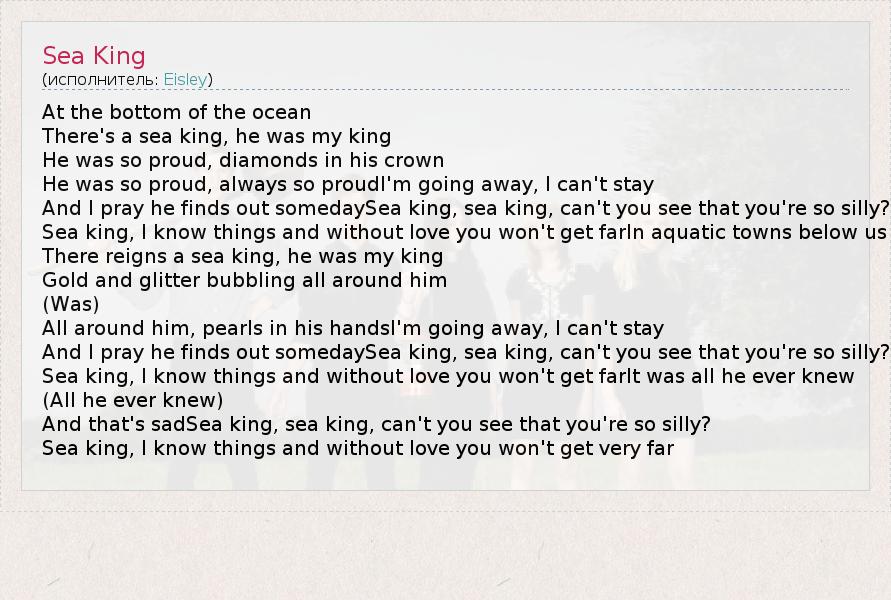 And I pray he finds out somedaySea king, sea king, can't you see that you're so silly?