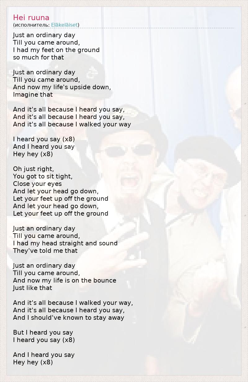 Just an ordinary day Till you came around, I had my feet on the ground so much for that Just an ordinary day Till you came around, And now my life's upside down, Imagine that And it's all because I heard you say, And it's all because I heard you say, And it's all because I walked your way I heard you say (х8) And I heard you say Hey hey (х8) Oh just right, You got to sit tight, Close your eyes And let your head go down, Let your feet up off the ground And let your head go down, Let your feet up off the ground Just an ordinary day Till you came around, I had my head straight and sound They've told me that Just an ordinary day Till you came around, And now my life is on the bounce Just like that And it's all because I walked your way, And it's all because I heard you say, And I should've known to stay away But I heard you say I heard you say (х8) And I heard you say Hey hey (х8)