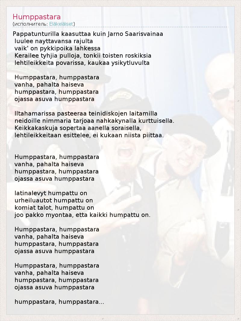 Pappatunturilla kaasuttaa kuin Jarno Saarisvainaa luulee nayttavansa rajulta vaik' on pykkipoika lahkessa Kerailee tyhjia pulloja, tonkii toisten roskiksia lehtileikkeita povarissa, kaukaa ysikytluvulta Humppastara, humppastara vanha, pahalta haiseva humppastara, humppastara ojassa asuva humppastara Iltahamarissa pasteeraa teinidiskojen laitamilla neidoille nimmaria tarjoaa nahkakynalla kurttuisella. Keikkakaskuja sopertaa aanella soraisella, lehtileikkeitaan esittelee, ei kukaan niista piittaa. Humppastara, humppastara vanha, pahalta haiseva humppastara, humppastara ojassa asuva humppastara latinalevyt humpattu on urheiluautot humpattu on komiat talot, humpattu on joo pakko myontaa, etta kaikki humpattu on. Humppastara, humppastara vanha, pahalta haiseva humppastara, humppastara ojassa asuva humppastara Humppastara, humppastara vanha, pahalta haiseva humppastara, humppastara ojassa asuva humppastara humppastara, humppastara...