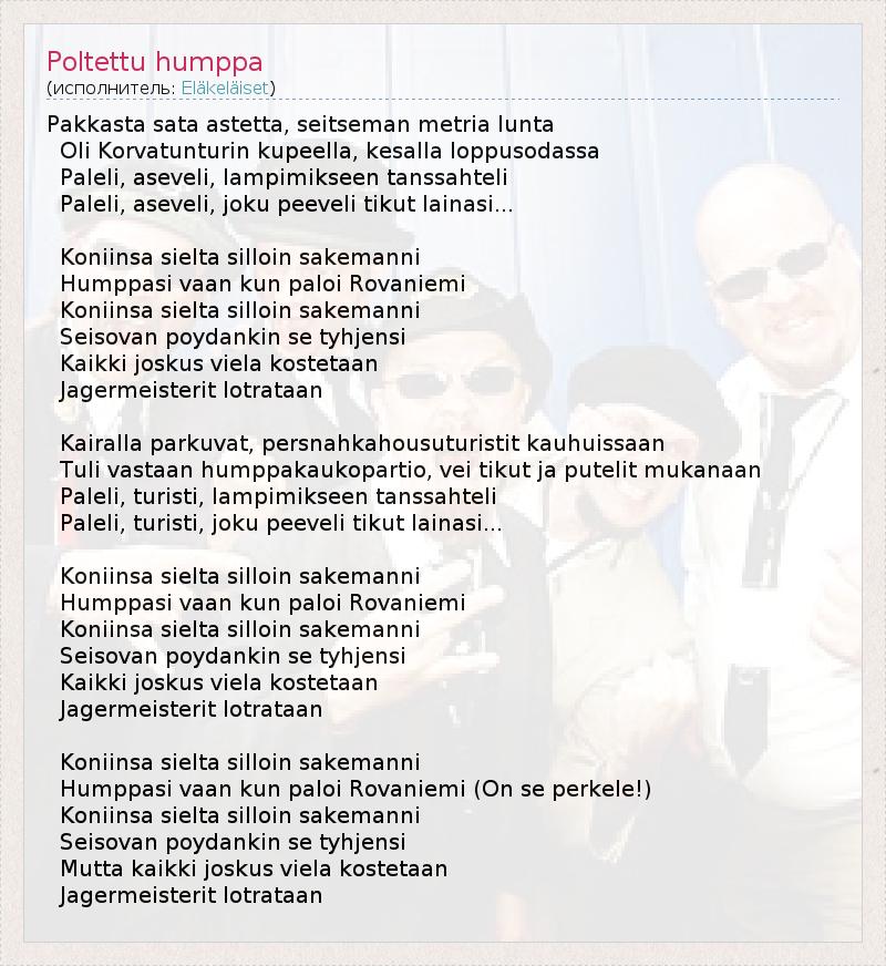 Pakkasta sata astetta, seitseman metria lunta Oli Korvatunturin kupeella, kesalla loppusodassa Paleli, aseveli, lampimikseen tanssahteli Paleli, aseveli, joku peeveli tikut lainasi... Koniinsa sielta silloin sakemanni Humppasi vaan kun paloi Rovaniemi Koniinsa sielta silloin sakemanni Seisovan poydankin se tyhjensi Kaikki joskus viela kostetaan Jagermeisterit lotrataan Kairalla parkuvat, persnahkahousuturistit kauhuissaan Tuli vastaan humppakaukopartio, vei tikut ja putelit mukanaan Paleli, turisti, lampimikseen tanssahteli Paleli, turisti, joku peeveli tikut lainasi... Koniinsa sielta silloin sakemanni Humppasi vaan kun paloi Rovaniemi Koniinsa sielta silloin sakemanni Seisovan poydankin se tyhjensi Kaikki joskus viela kostetaan Jagermeisterit lotrataan Koniinsa sielta silloin sakemanni Humppasi vaan kun paloi Rovaniemi (On se perkele!) Koniinsa sielta silloin sakemanni Seisovan poydankin se tyhjensi Mutta kaikki joskus viela kostetaan Jagermeisterit lotrataan