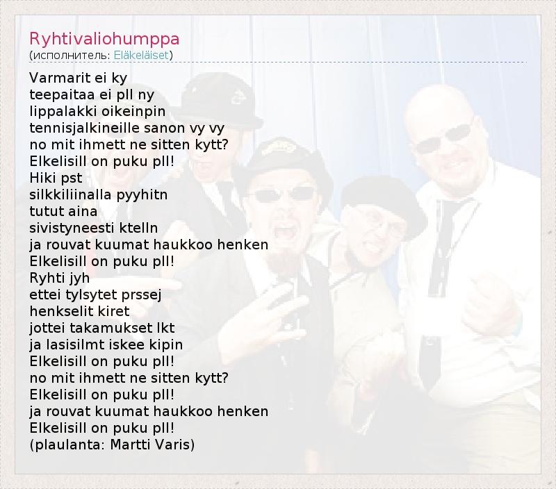 Это интересно:Eläkeläiset (фин. «Пенсионеры») — финский ансамбль, играющий музыку в стиле хумппа (финская разновидность быстрого фокстрота), преимущественно кавер-версии известных рок- и поп-хитов. Образовался в 1993 году. На протяжении существования ансамбля его состав претерпевал некоторые изменения, но наиболее постоянными участниками являются Онни Варис (клавишные, вокал), Матти Варис (бас-гитара,... продолжение
