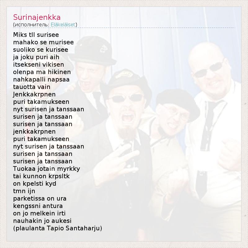 Это интересно:Eläkeläiset (фин. «Пенсионеры») — финский ансамбль, играющий музыку в стиле хумппа (финская разновидность быстрого фокстрота), преимущественно кавер-версии известных рок- и поп-хитов. Образовался в 1993 году. На протяжении существования ансамбля его состав претерпевал некоторые изменения, но наиболее постоянными участниками являются Онни Варис (клавишные, вокал), Матти Варис (бас-гитара,... продолжение