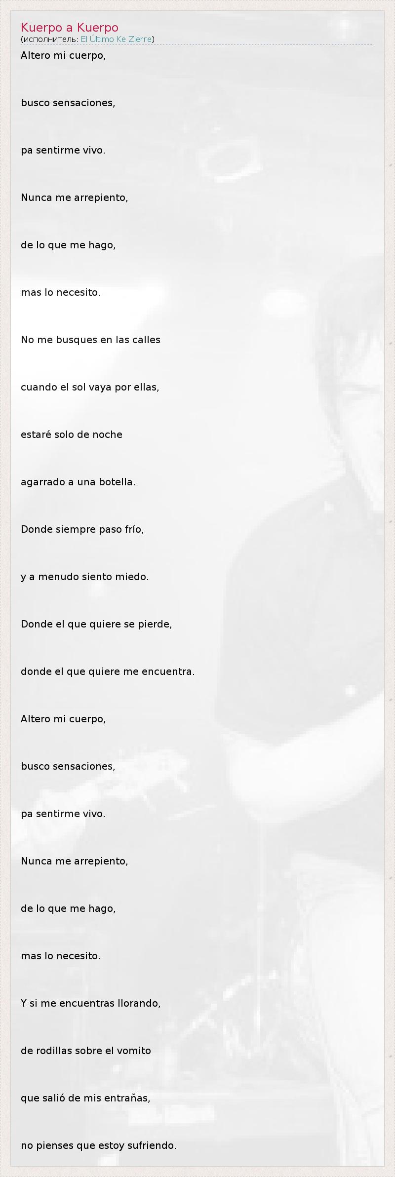 Altero mi cuerpo, busco sensaciones, pa sentirme vivo. Nunca me arrepiento, de lo que me hago, mas lo necesito. No me busques en las calles cuando el sol vaya por ellas, estaré solo de noche agarrado a una botella. Donde siempre paso frío, y a menudo siento miedo. Donde el que quiere se pierde, donde el que quiere me encuentra. Altero mi cuerpo, busco sensaciones, pa sentirme vivo. Nunca me arrepiento, de lo que me hago, mas lo necesito. Y si me encuentras llorando, de rodillas sobre el vomito que salió de mis entrañas, no pienses que estoy sufriendo.