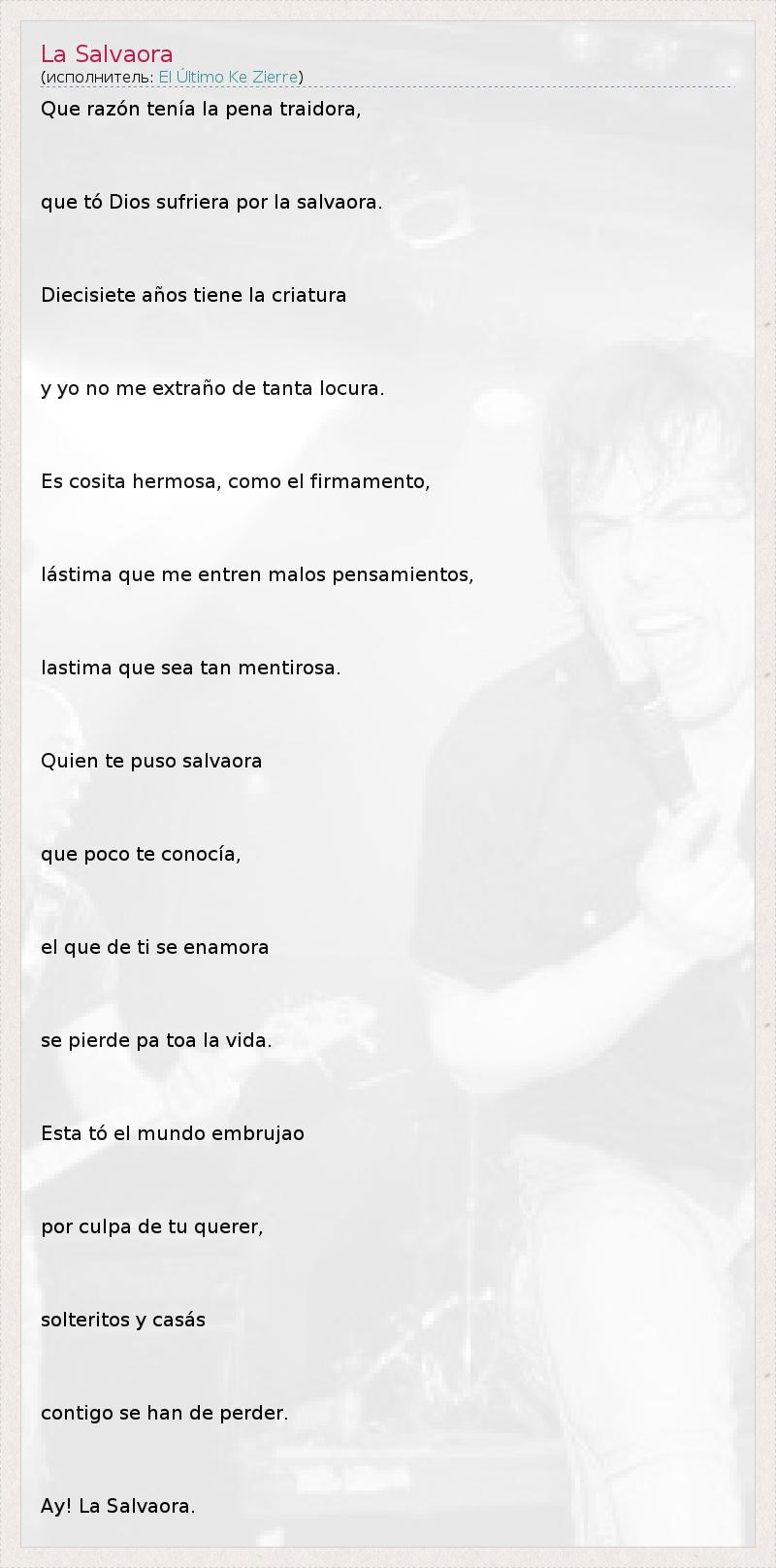 Que razón tenía la pena traidora, que tó Dios sufriera por la salvaora. Diecisiete años tiene la criatura y yo no me extraño de tanta locura. Es cosita hermosa, como el firmamento, lástima que me entren malos pensamientos, lastima que sea tan mentirosa. Quien te puso salvaora que poco te conocía, el que de ti se enamora se pierde pa toa la vida. Esta tó el mundo embrujao por culpa de tu querer, solteritos y casás contigo se han de perder. Ay! La Salvaora.
