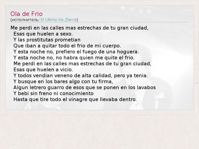 Me perdi en las calles mas estrechas de tu gran ciudad, Esas que huelen a sexo. Y las prostitutas prometian Que iban a quitar todo el frio de mi cuerpo. Y esta noche no, prefiero el fuego de una hoguera. Y esta noche no, no habra quien me quite el frio. Me perdi en las calles mas estrechas de tu gran ciudad, Esas que huelen a vicio. Y todos vendian veneno de alta calidad, pero ya tenia. Y busque en los bares algo con tu firma, Algun letrero guarro de esos que se ponen en los lavabos Y bebi sin freno ni conocimiento Hasta que tire todo el vinagre que llevaba dentro.
