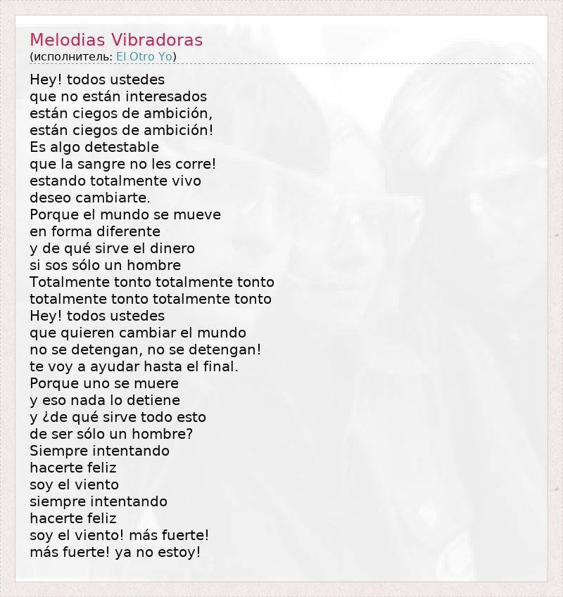 Эй ! Todos ustedes не дие нет Estan interesados Estan ciegos де Ambicion , Estan ciegos де Ambicion ! Es алгоритм мерзость дие ла Sangre нет ле соот ! estando Totalmente естественных Deseo cambiarte . Porque El Mundo себе Mueve ан Forma Diferente у де qué Sirve эль Dinero си SOS Sólo ООН Hombre Totalmente Тонто Totalmente Тонто Totalmente Тонто Totalmente Тонто Эй ! Todos ustedes дие quieren Cambiar El Mundo нет таковой detengan , нет таковой detengan ! Те Voyayudar хаста эль финал. Porque UNO себе muere у ESO нада вот detiene у ¿ де qué Sirve TODO Эсто де сер Sólo ООН Hombre ? Siempre intentando hacerte Фелис соевый эль Viento Siempre intentando hacerte Фелис соевый эль Viento ! más Фуэрте ! más Фуэрте ! не я не Estoy !