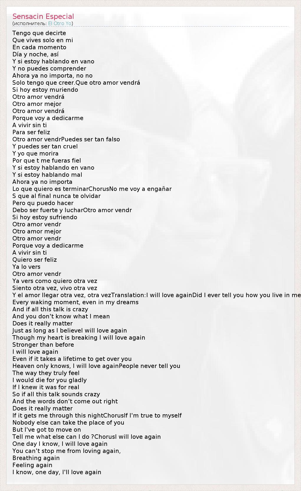 Tengo que decirte Que vives solo en mi En cada momento Día y noche, así Y si estoy hablando en vano Y no puedes comprender Ahora ya no importa, no no Solo tengo que creer.Que otro amor vendrá Si hoy estoy muriendo Otro amor vendrá Otro amor mejor Otro amor vendrá Porque voy a dedicarme A vivir sin ti Para ser feliz Otro amor vendrPuedes ser tan falso Y puedes ser tan cruel Y yo que morira Por que t me fueras fiel Y si estoy hablando en vano Y si estoy hablando mal Ahora ya no importa Lo que quiero es terminarChorusNo me voy a engañar S que al final nunca te olvidar Pero qu puedo hacer Debo ser fuerte y lucharOtro amor vendr Si hoy estoy sufriendo Otro amor vendr Otro amor mejor Otro amor vendr Porque voy a dedicarme A vivir sin ti Quiero ser feliz Ya lo vers Otro amor vendr Ya vers como quiero otra vez Siento otra vez, vivo otra vez Y el amor llegar otra vez, otra vezTranslation:I will love againDid I ever tell you how you live in me Every waking moment, even in my dreams And if all this talk is crazy And you don't know what I mean Does it really matter Just as long as I believeI will love again Though my heart is breaking I will love again Stronger than before I will love again Even if it takes a lifetime to get over you Heaven only knows, I will love againPeople never tell you The way they truly feel I would die for you gladly If I knew it was for real So if all this talk sounds crazy And the words don't come out right Does it really matter If it gets me through this nightChorusIf I'm true to myself Nobody else can take the place of you But I've got to move on Tell me what else can I do ?ChorusI will love again One day I know, I will love again You can't stop me from loving again, Breathing again Feeling again I know, one day, I'll love again