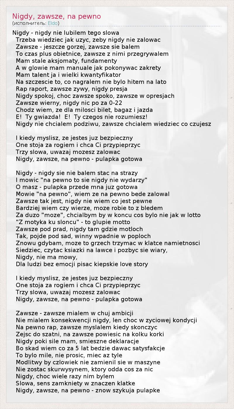 Nigdy - nigdy nie lubilem tego slowa Trzeba wiedziec jak uzyc, zeby nigdy nie zalowac Zawsze - jeszcze gorzej, zawsze sie balem To czas plus obietnice, zawsze z nimi przegrywalem Mam stale aksjomaty, fundamenty A w glowie mam manuale jak pokonywac zakrety Mam talent ja i wielki kwantyfikator Na szczescie to, co nagralem nie bylo hitem na lato Rap raport, zawsze zywy, nigdy presja Nigdy spokoj, choc zawsze spoko, zawsze w opresjach Zawsze wierny, nigdy nic po za 0-22 Chodz wiem, ze dla milosci bilet, bagaz i jazda E! Ty gwiazda! E! Ty czegos nie rozumiesz! Nigdy nie chcialem podziwu, zawsze chcialem wiedziec co czujesz I kiedy myslisz, ze jestes juz bezpieczny One stoja za rogiem i chca Ci przypieprzyc Trzy slowa, uwazaj mozesz zalowac Nigdy, zawsze, na pewno - pulapka gotowa Nigdy - nigdy sie nie balem stac na strazy I mowic "na pewno to sie nigdy nie wydarzy" O masz - pulapka przede mna juz gotowa Mowie "na pewno", wiem ze na pewno bede zalowal Zawsze tak jest, nigdy nie wiem co jest pewne Bardziej wiem czy wierze, moze robie to z bledem Za duzo "moze", chcialbym by w koncu cos bylo nie jak w lotto "Z motyka ku sloncu" - to glupie motto Zawsze pod prad, nigdy tam gdzie motloch Tak, pojde pod sad, winny wpadnie w poploch Znowu gdybam, moze to grzech trzymac w klatce namietnosci Siedziec, czytac ksiazki na lawce i pozbyc sie wiary, Nigdy, nie ma mowy, Dla ludzi bez emocji pisac kiepskie love story I kiedy myslisz, ze jestes juz bezpieczny One stoja za rogiem i chca Ci przypieprzyc Trzy slowa, uwazaj mozesz zalowac Nigdy, zawsze, na pewno - pulapka gotowa Zawsze - zawsze mialem w chuj ambicji Nie mialem konsekwencji nigdy, len choc w zyciowej kondycji Na pewno rap, zawsze myslalem kiedy skonczyc Zejsc do szatni, na zawsze powiesic na kolku korki Nigdy poki sile mam, smieszne deklaracje Bo skad wiem co za 5 lat bedzie dawac satysfakcje To bylo mile, nie prosic, miec az tyle Modlitwy by czlowiek nie zamienil sie w maszyne Nie zostac skurwysynem, ktory odda cos za nic Nigdy, choc wiele razy nim bylem Slowa, sens zamkniety w znaczen klatke Nigdy, zawsze, na pewno - znow szykuja pulapke
