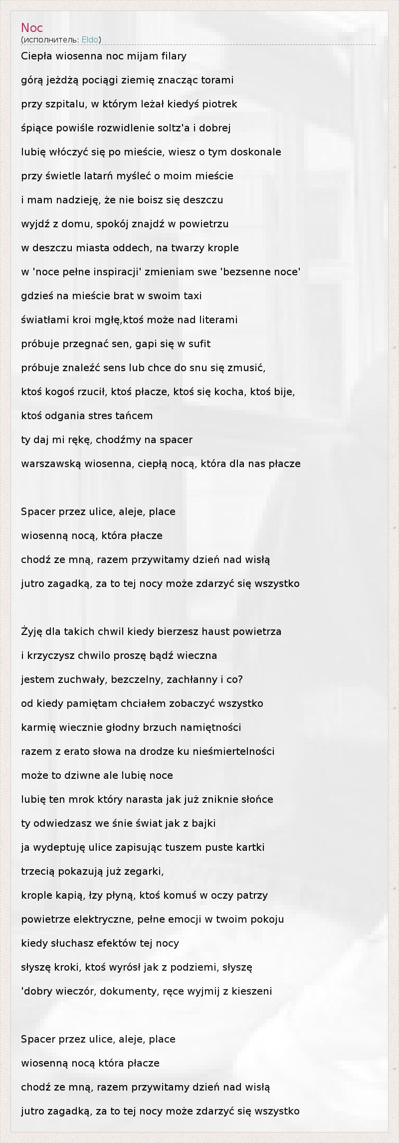 Ciepła wiosenna noc mijam filary górą jeżdżą pociągi ziemię znacząc torami przy szpitalu, w którym leżał kiedyś piotrek śpiące powiśle rozwidlenie soltz'a i dobrej lubię włóczyć się po mieście, wiesz o tym doskonale przy świetle latarń myśleć o moim mieście i mam nadzieję, że nie boisz się deszczu wyjdź z domu, spokój znajdź w powietrzu w deszczu miasta oddech, na twarzy krople w 'noce pełne inspiracji' zmieniam swe 'bezsenne noce' gdzieś na mieście brat w swoim taxi światłami kroi mgłę,ktoś może nad literami próbuje przegnać sen, gapi się w sufit próbuje znaleźć sens lub chce do snu się zmusić, ktoś kogoś rzucił, ktoś płacze, ktoś się kocha, ktoś bije, ktoś odgania stres tańcem ty daj mi rękę, chodźmy na spacer warszawską wiosenna, ciepłą nocą, która dla nas płacze Spacer przez ulice, aleje, place wiosenną nocą, która płacze chodź ze mną, razem przywitamy dzień nad wisłą jutro zagadką, za to tej nocy może zdarzyć się wszystko Żyję dla takich chwil kiedy bierzesz haust powietrza i krzyczysz chwilo proszę bądź wieczna jestem zuchwały, bezczelny, zachłanny i co? od kiedy pamiętam chciałem zobaczyć wszystko karmię wiecznie głodny brzuch namiętności razem z erato słowa na drodze ku nieśmiertelności może to dziwne ale lubię noce lubię ten mrok który narasta jak już zniknie słońce ty odwiedzasz we śnie świat jak z bajki ja wydeptuję ulice zapisując tuszem puste kartki trzecią pokazują już zegarki, krople kapią, łzy płyną, ktoś komuś w oczy patrzy powietrze elektryczne, pełne emocji w twoim pokoju kiedy słuchasz efektów tej nocy słyszę kroki, ktoś wyrósł jak z podziemi, słyszę 'dobry wieczór, dokumenty, ręce wyjmij z kieszeni Spacer przez ulice, aleje, place wiosenną nocą która płacze chodź ze mną, razem przywitamy dzień nad wisłą jutro zagadką, za to tej nocy może zdarzyć się wszystko