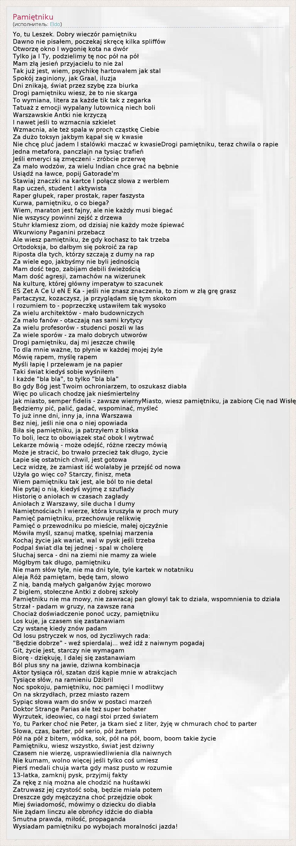 Yo, tu Leszek. Dobry wieczór pamiętniku Dawno nie pisałem, poczekaj skręcę kilka spliffów Otworzę okno I wygonię kota na dwór Tylko ja I Ty, podzielimy tę noc pół na pół Mam złą jesień przyjacielu to nie żal Tak już jest, wiem, psychikę hartowałem jak stal Spokój zaginiony, jak Graal, iluzja Dni znikają, świat przez szybę zza biurka Drogi pamiętniku wiesz, że to nie skarga To wymiana, litera za każde tik tak z zegarka Tatuaż z emocji wypalany lutownicą niech boli Warszawskie Antki nie krzyczą I nawet jeśli to wzmacnia szkielet Wzmacnia, ale też spala w proch cząstkę Ciebie Za dużo toksyn jakbym kąpał się w kwasie Nie chcę pluć jadem I stalówki maczać w kwasieDrogi pamiętniku, teraz chwila o rapie Jedna metafora, panczlajn na tysiąc trafień Jeśli emeryci są zmęczeni - zróbcie przerwę Za mało wodzów, za wielu Indian chce grać na bębnie Usiądź na ławce, popij Gatorade'm Stawiaj znaczki na kartce I połącz słowa z werblem Rap uczeń, student I aktywista Raper głupek, raper prostak, raper faszysta Kurwa, pamiętniku, o co biega? Wiem, maraton jest fajny, ale nie każdy musi biegać Nie wszyscy powinni zejść z drzewa Stuhr kłamiesz ziom, od dzisiaj nie każdy może śpiewać Wkurwiony Paganini przebacz Ale wiesz pamiętniku, że gdy kochasz to tak trzeba Ortodoksja, bo dałbym się pokroić za rap Riposta dla tych, którzy szczają z dumy na rap Za wiele ego, jakbyśmy nie byli jednością Mam dość tego, zabijam debili świeżością Mam dość agresji, zamachów na wizerunek Na kulturę, której główny imperatyw to szacunek ES Zet A Ce U eN E Ka - jeśli nie znasz znaczenia, to ziom w złą grę grasz Partaczysz, kozaczysz, ja przyglądam się tym skokom I rozumiem to - poprzeczkę ustawiłem tak wysoko Za wielu architektów - mało budowniczych Za mało fanów - otaczają nas sami krytycy Za wielu profesorów - studenci poszli w las Za wiele sporów - za mało dobrych utworów Drogi pamiętniku, daj mi jeszcze chwilę To dla mnie ważne, to płynie w każdej mojej żyle Mówię rapem, myślę rapem Myśli łapię I przelewam je na papier Taki świat kiedyś sobie wyśniłem I każde "bla bla", to tylko "bla bla" Bo gdy Bóg jest Twoim ochroniarzem, to oszukasz diabła Więc po ulicach chodzę jak nieśmiertelny Jak miasto, semper fidelis - zawsze wiernyMiasto, wiesz pamiętniku, ja zabiorę Cię nad Wisłę Będziemy pić, palić, gadać, wspominać, myśleć To już inne dni, inny ja, inna Warszawa Bez niej, jeśli nie ona o niej opowiada Biła się pamiętniku, ja patrzyłem z bliska To boli, lecz to obowiązek stać obok I wytrwać Lekarze mówią - może odejść, różne rzeczy mówią Może je stracić, bo trwało przecież tak długo, życie Łapie się ostatnich chwil, jest gotowa Lecz widzę, że zamiast iść wolałaby je przejść od nowa Użyła go więc co? Starczy, finisz, meta Wiem pamiętniku tak jest, ale ból to nie detal Nie pytaj o nią, kiedyś wyjmę z szuflady Historię o aniołach w czasach zagłady Aniołach z Warszawy, sile ducha I dumy Namiętnościach I wierze, która kruszyła w proch mury Pamięć pamiętniku, przechowuje relikwię Pamięć o przewodniku po mieście, małej ojczyźnie Mówiła myśl, szanuj matkę, spełniaj marzenia Kochaj życie jak wariat, wal w pysk jeśli trzeba Podpal świat dla tej jednej - spal w cholerę Słuchaj serca - dni na ziemi nie mamy za wiele Mógłbym tak długo, pamiętniku Nie mam słów tyle, nie ma dni tyle, tyle kartek w notatniku Aleja Róż pamiętam, będę tam, słowo Z nią, bandą małych gałganów żyjąc morowo Z biglem, stołeczne Antki z dobrej szkoły Pamiętniku nie ma mowy, nie zawracaj pan głowyI tak to działa, wspomnienia to działa Strzał - padam w gruzy, na zawsze rana Chociaż doświadczenie ponoć uczy, pamiętniku Los kuje, ja czasem się zastanawiam Czy wstanę kiedy znów padam Od losu pstryczek w nos, od życzliwych rada: "Będzie dobrze" - weź spierdalaj... weź idź z naiwnym pogadaj Git, życie jest, starczy nie wymagam Biorę - dziękuję, I dalej się zastanawiam Ból plus sny na jawie, dziwna kombinacja Aktor tysiąca ról, szatan dziś kąpie mnie w atrakcjach Tysiące słów, na ramieniu Dżibril Noc spokoju, pamiętniku, noc pamięci I modlitwy On na skrzydłach, przez miasto razem Sypiąc słowa wam do snów w postaci marzeń Doktor Strange Parias ale też super bohater Wyrzutek, ideowiec, co nagi stoi przed światem Yo, tu Parker choć nie Peter, ja tkam sieć z liter, żyję w chmurach choć to parter Słowa, czas, barter, pół serio, pół żartem Pół na pół z bitem, wódka, sok, pół na pół, boom, boom takie życie Pamiętniku, wiesz wszystko, świat jest dziwny Czasem nie wierzę, usprawiedliwienia dla naiwnych Nie kumam, wolno więcej jeśli tylko coś umiesz Pierś medali chuja warta gdy masz pusto w rozumie 13-latka, zamknij pysk, przyjmij fakty Za rękę z nią można ale chodzić na huśtawki Zatruwasz jej czystość sobą, będzie miała potem Dreszcze gdy mężczyzna choć przejdzie obok Miej świadomość, mówimy o dziecku do diabła Nie żądam linczu ale obrońcy idźcie do diabła Smutna prawda, miłość, propaganda Wysiadam pamiętniku po wybojach moralności jazda!