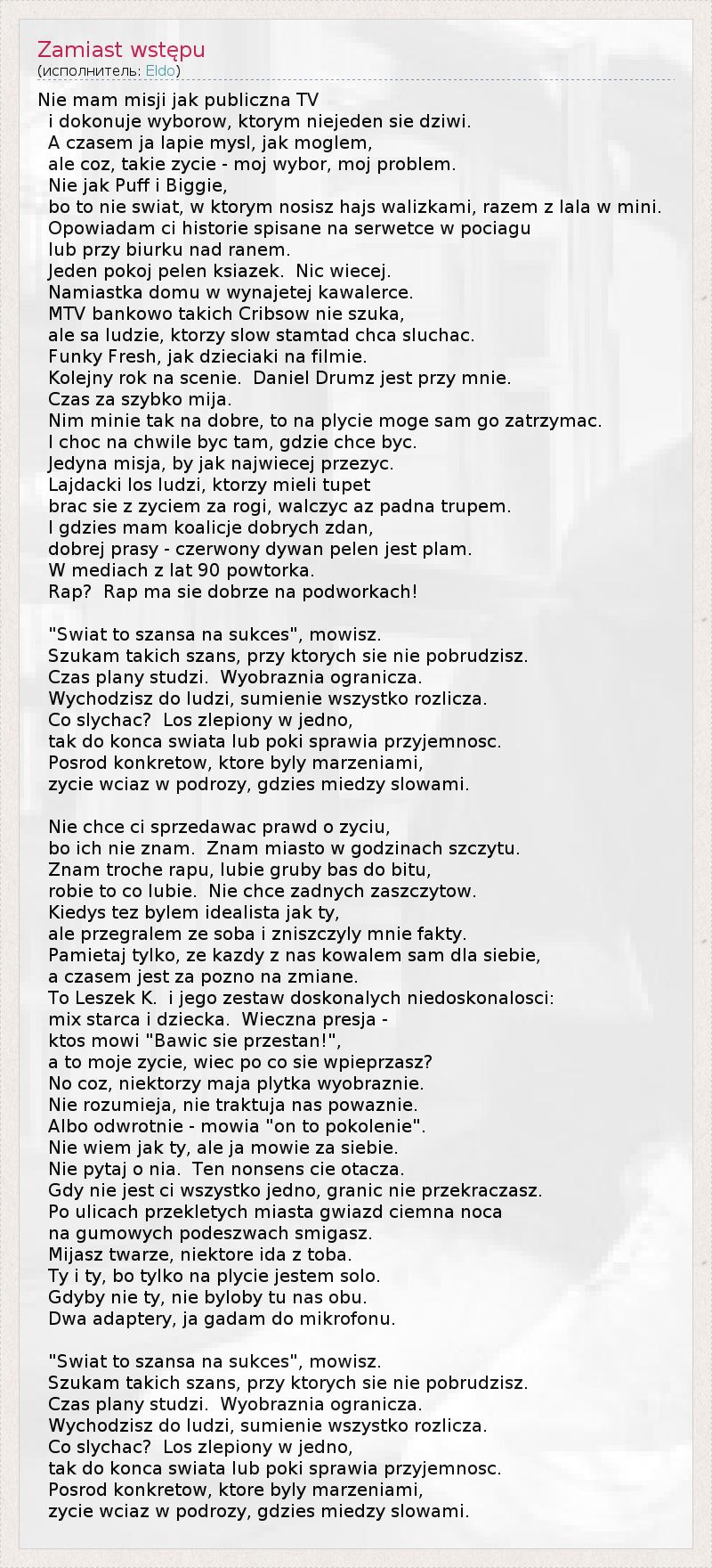 Nie mam misji jak publiczna TV i dokonuje wyborow, ktorym niejeden sie dziwi. A czasem ja lapie mysl, jak moglem, ale coz, takie zycie - moj wybor, moj problem. Nie jak Puff i Biggie, bo to nie swiat, w ktorym nosisz hajs walizkami, razem z lala w mini. Opowiadam ci historie spisane na serwetce w pociagu lub przy biurku nad ranem. Jeden pokoj pelen ksiazek. Nic wiecej. Namiastka domu w wynajetej kawalerce. MTV bankowo takich Cribsow nie szuka, ale sa ludzie, ktorzy slow stamtad chca sluchac. Funky Fresh, jak dzieciaki na filmie. Kolejny rok na scenie. Daniel Drumz jest przy mnie. Czas za szybko mija. Nim minie tak na dobre, to na plycie moge sam go zatrzymac. I choc na chwile byc tam, gdzie chce byc. Jedyna misja, by jak najwiecej przezyc. Lajdacki los ludzi, ktorzy mieli tupet brac sie z zyciem za rogi, walczyc az padna trupem. I gdzies mam koalicje dobrych zdan, dobrej prasy - czerwony dywan pelen jest plam. W mediach z lat 90 powtorka. Rap? Rap ma sie dobrze na podworkach! "Swiat to szansa na sukces", mowisz. Szukam takich szans, przy ktorych sie nie pobrudzisz. Czas plany studzi. Wyobraznia ogranicza. Wychodzisz do ludzi, sumienie wszystko rozlicza. Co slychac? Los zlepiony w jedno, tak do konca swiata lub poki sprawia przyjemnosc. Posrod konkretow, ktore byly marzeniami, zycie wciaz w podrozy, gdzies miedzy slowami. Nie chce ci sprzedawac prawd o zyciu, bo ich nie znam. Znam miasto w godzinach szczytu. Znam troche rapu, lubie gruby bas do bitu, robie to co lubie. Nie chce zadnych zaszczytow. Kiedys tez bylem idealista jak ty, ale przegralem ze soba i zniszczyly mnie fakty. Pamietaj tylko, ze kazdy z nas kowalem sam dla siebie, a czasem jest za pozno na zmiane. To Leszek K. i jego zestaw doskonalych niedoskonalosci: mix starca i dziecka. Wieczna presja - ktos mowi "Bawic sie przestan!", a to moje zycie, wiec po co sie wpieprzasz? No coz, niektorzy maja plytka wyobraznie. Nie rozumieja, nie traktuja nas powaznie. Albo odwrotnie - mowia "on to pokolenie". Nie wiem jak ty, ale ja mowie za siebie. Nie pytaj o nia. Ten nonsens cie otacza. Gdy nie jest ci wszystko jedno, granic nie przekraczasz. Po ulicach przekletych miasta gwiazd ciemna noca na gumowych podeszwach smigasz. Mijasz twarze, niektore ida z toba. Ty i ty, bo tylko na plycie jestem solo. Gdyby nie ty, nie byloby tu nas obu. Dwa adaptery, ja gadam do mikrofonu. "Swiat to szansa na sukces", mowisz. Szukam takich szans, przy ktorych sie nie pobrudzisz. Czas plany studzi. Wyobraznia ogranicza. Wychodzisz do ludzi, sumienie wszystko rozlicza. Co slychac? Los zlepiony w jedno, tak do konca swiata lub poki sprawia przyjemnosc. Posrod konkretow, ktore byly marzeniami, zycie wciaz w podrozy, gdzies miedzy slowami.
