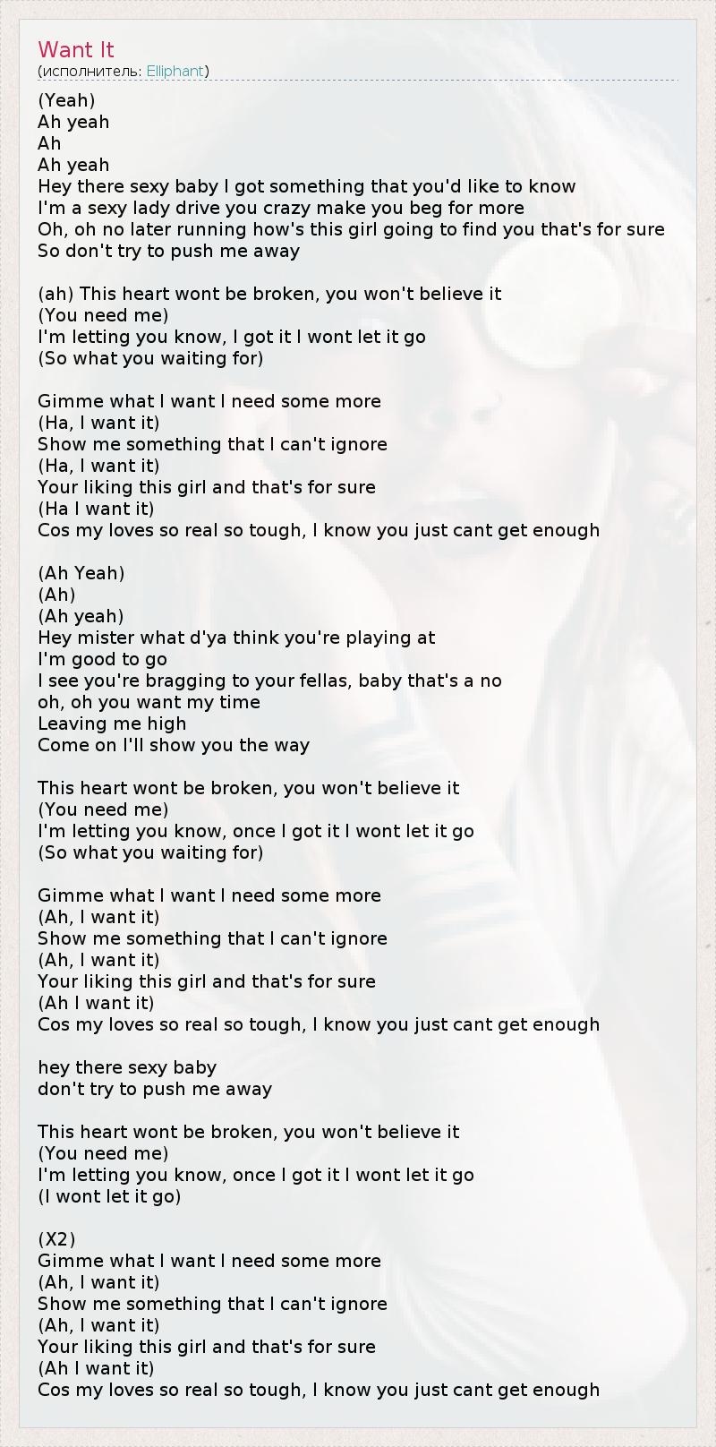 (Yeah) Ah yeah Ah Ah yeah Hey there sexy baby I got something that you'd like to know I'm a sexy lady drive you crazy make you beg for more Oh, oh no later running how's this girl going to find you that's for sure So don't try to push me away (ah) This heart wont be broken, you won't believe it (You need me) I'm letting you know, I got it I wont let it go (So what you waiting for) Gimme what I want I need some more (Ha, I want it) Show me something that I can't ignore (Ha, I want it) Your liking this girl and that's for sure (Ha I want it) Cos my loves so real so tough, I know you just cant get enough (Ah Yeah) (Ah) (Ah yeah) Hey mister what d'ya think you're playing at I'm good to go I see you're bragging to your fellas, baby that's a no oh, oh you want my time Leaving me high Come on I'll show you the way This heart wont be broken, you won't believe it (You need me) I'm letting you know, once I got it I wont let it go (So what you waiting for) Gimme what I want I need some more (Ah, I want it) Show me something that I can't ignore (Ah, I want it) Your liking this girl and that's for sure (Ah I want it) Cos my loves so real so tough, I know you just cant get enough hey there sexy baby don't try to push me away This heart wont be broken, you won't believe it (You need me) I'm letting you know, once I got it I wont let it go (I wont let it go) (X2) Gimme what I want I need some more (Ah, I want it) Show me something that I can't ignore (Ah, I want it) Your liking this girl and that's for sure (Ah I want it) Cos my loves so real so tough, I know you just cant get enough