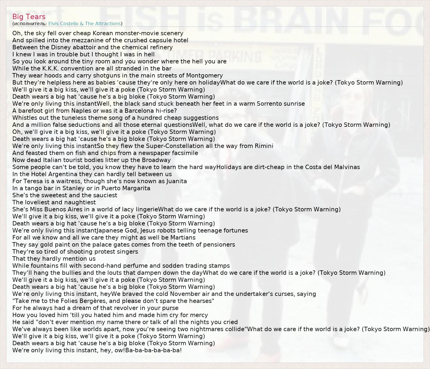 And a million false seductions and all those eternal questionsWell, what do we care if the world is a joke? (Tokyo Storm Warning)