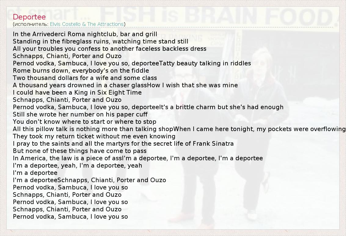 Pernod vodka, Sambuca, I love you so, deporteeTatty beauty talking in riddles