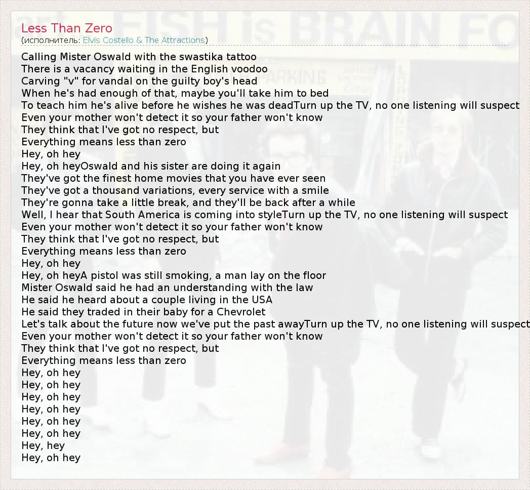 Calling Mister Oswald with the swastika tattoo There is a vacancy waiting in the English voodoo Carving "v" for vandal on the guilty boy's head When he's had enough of that, maybe you'll take him to bed To teach him he's alive before he wishes he was deadTurn up the TV, no one listening will suspect Even your mother won't detect it so your father won't know They think that I've got no respect, but Everything means less than zero Hey, oh hey Hey, oh heyOswald and his sister are doing it again They've got the finest home movies that you have ever seen They've got a thousand variations, every service with a smile They're gonna take a little break, and they'll be back after a while Well, I hear that South America is coming into styleTurn up the TV, no one listening will suspect Even your mother won't detect it so your father won't know They think that I've got no respect, but Everything means less than zero Hey, oh hey Hey, oh heyA pistol was still smoking, a man lay on the floor Mister Oswald said he had an understanding with the law He said he heard about a couple living in the USA He said they traded in their baby for a Chevrolet Let's talk about the future now we've put the past awayTurn up the TV, no one listening will suspect Even your mother won't detect it so your father won't know They think that I've got no respect, but Everything means less than zero Hey, oh hey Hey, oh hey Hey, oh hey Hey, oh hey Hey, oh hey Hey, oh hey Hey, hey Hey, oh hey