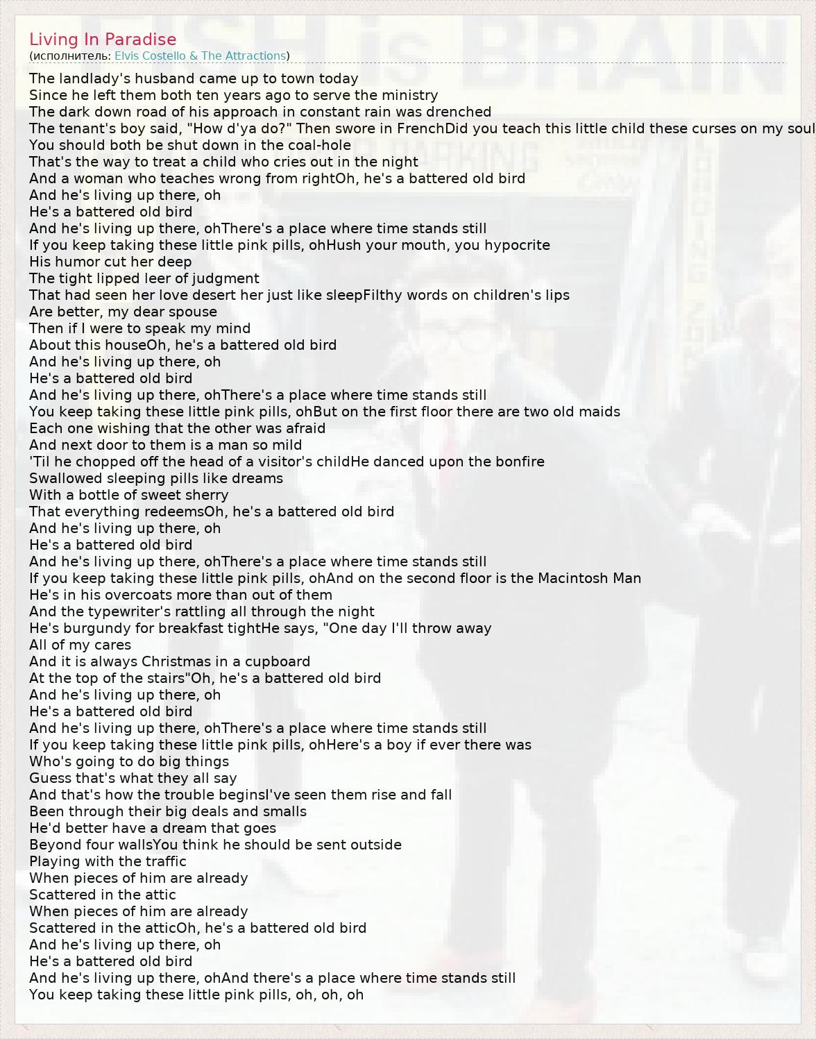 The landlady's husband came up to town today Since he left them both ten years ago to serve the ministry The dark down road of his approach in constant rain was drenched The tenant's boy said, "How d'ya do?" Then swore in FrenchDid you teach this little child these curses on my soul You should both be shut down in the coal-hole That's the way to treat a child who cries out in the night And a woman who teaches wrong from rightOh, he's a battered old bird And he's living up there, oh He's a battered old bird And he's living up there, ohThere's a place where time stands still If you keep taking these little pink pills, ohHush your mouth, you hypocrite His humor cut her deep The tight lipped leer of judgment That had seen her love desert her just like sleepFilthy words on children's lips Are better, my dear spouse Then if I were to speak my mind About this houseOh, he's a battered old bird And he's living up there, oh He's a battered old bird And he's living up there, ohThere's a place where time stands still You keep taking these little pink pills, ohBut on the first floor there are two old maids Each one wishing that the other was afraid And next door to them is a man so mild 'Til he chopped off the head of a visitor's childHe danced upon the bonfire Swallowed sleeping pills like dreams With a bottle of sweet sherry That everything redeemsOh, he's a battered old bird And he's living up there, oh He's a battered old bird And he's living up there, ohThere's a place where time stands still If you keep taking these little pink pills, ohAnd on the second floor is the Macintosh Man He's in his overcoats more than out of them And the typewriter's rattling all through the night He's burgundy for breakfast tightHe says, "One day I'll throw away All of my cares And it is always Christmas in a cupboard At the top of the stairs"Oh, he's a battered old bird And he's living up there, oh He's a battered old bird And he's living up there, ohThere's a place where time stands still If you keep taking these little pink pills, ohHere's a boy if ever there was Who's going to do big things Guess that's what they all say And that's how the trouble beginsI've seen them rise and fall Been through their big deals and smalls He'd better have a dream that goes Beyond four wallsYou think he should be sent outside Playing with the traffic When pieces of him are already Scattered in the attic When pieces of him are already Scattered in the atticOh, he's a battered old bird And he's living up there, oh He's a battered old bird And he's living up there, ohAnd there's a place where time stands still You keep taking these little pink pills, oh, oh, oh