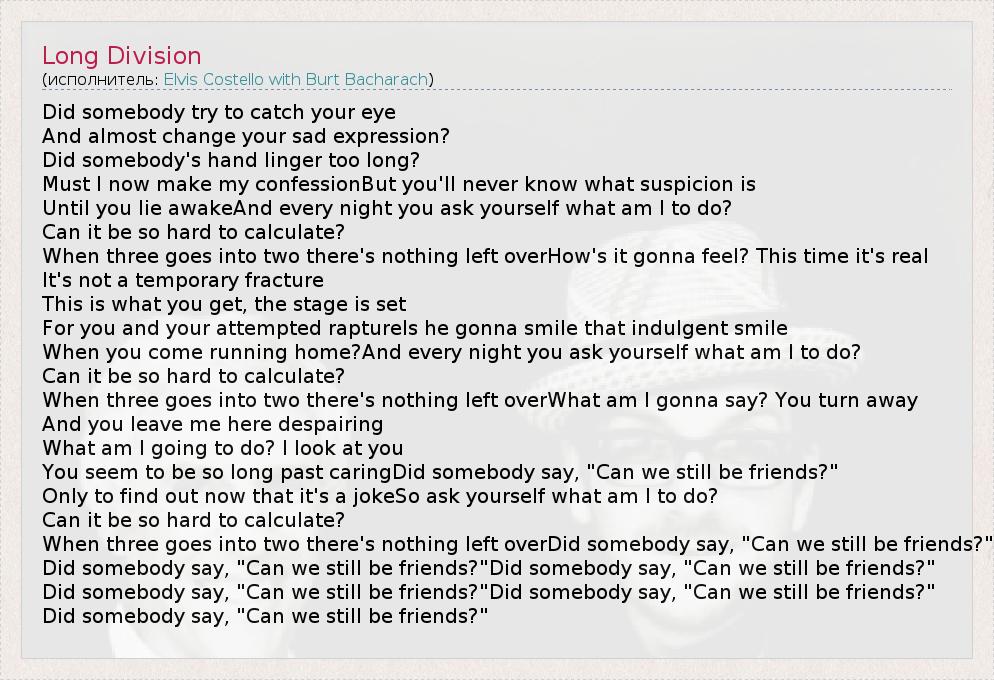 When three goes into two there's nothing left overDid somebody say, "Can we still be friends?"
