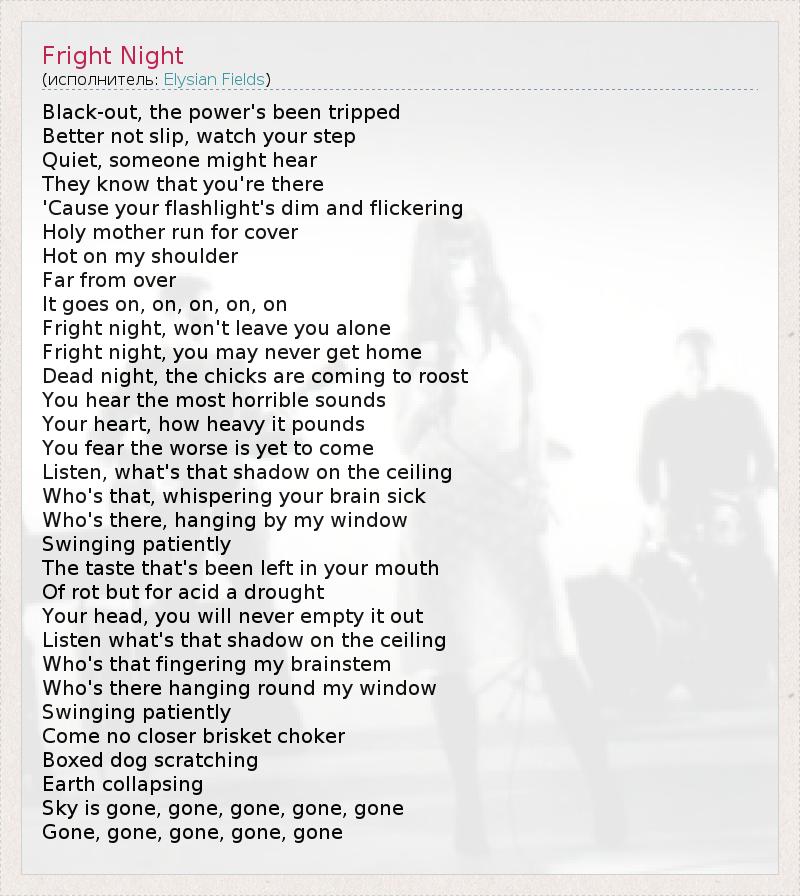 Black-out, the power's been tripped Better not slip, watch your step Quiet, someone might hear They know that you're there 'Cause your flashlight's dim and flickering Holy mother run for cover Hot on my shoulder Far from over It goes on, on, on, on, on Fright night, won't leave you alone Fright night, you may never get home Dead night, the chicks are coming to roost You hear the most horrible sounds Your heart, how heavy it pounds You fear the worse is yet to come Listen, what's that shadow on the ceiling Who's that, whispering your brain sick Who's there, hanging by my window Swinging patiently The taste that's been left in your mouth Of rot but for acid a drought Your head, you will never empty it out Listen what's that shadow on the ceiling Who's that fingering my brainstem Who's there hanging round my window Swinging patiently Come no closer brisket choker Boxed dog scratching Earth collapsing Sky is gone, gone, gone, gone, gone Gone, gone, gone, gone, gone